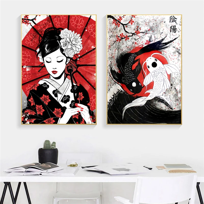 Японская геиша и Инь-Ян, рыба, Самурай, масляная Картина на холсте, Постер и принты, Настенная картина для украшения гостиной
