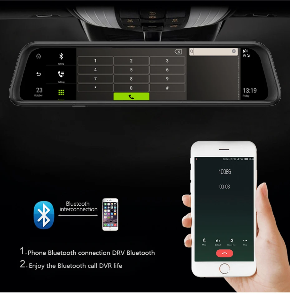 Функция громкой связи BluetoothБлагодаря bluetooth hands-free, После сопряжения bluetooth между видеорегистратором и смартфоном, вы можете совершать и принимать звонки непосредственно с самого видеорегистратора со встроенным микрофоном и динамиком.