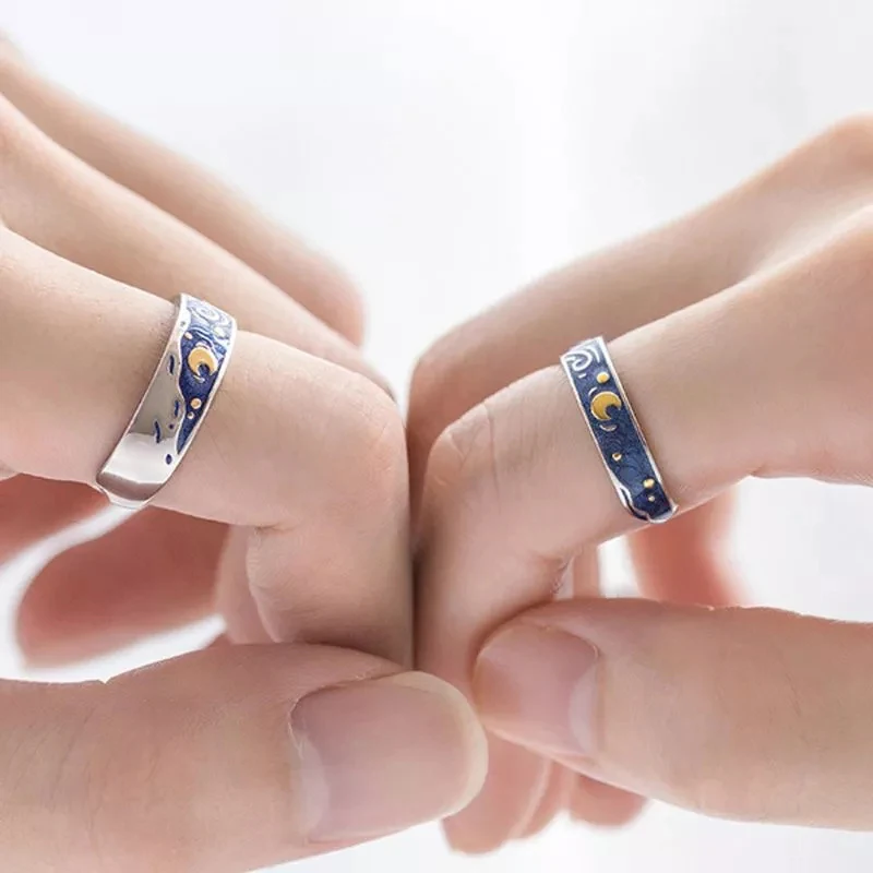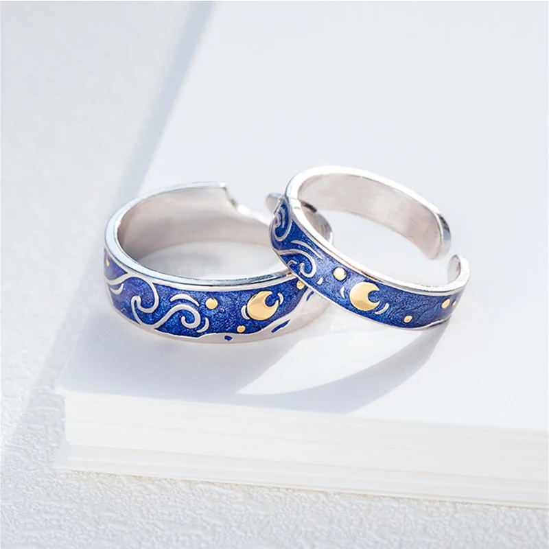S925 Van Gogh звездное небо открытые влюбленные кольца Band романти...