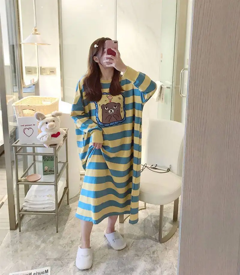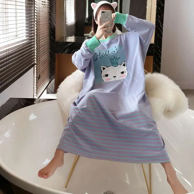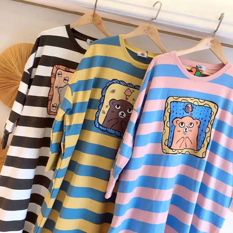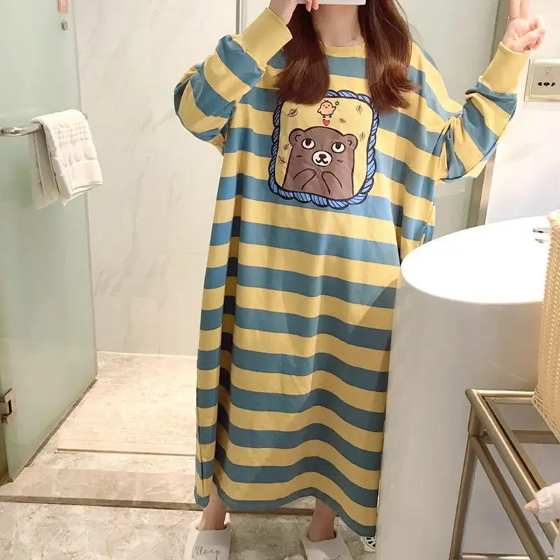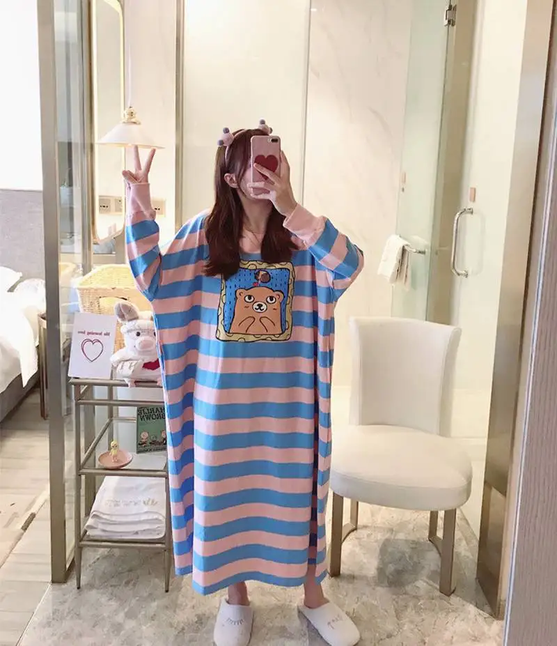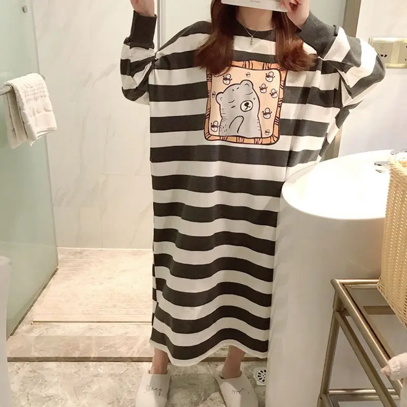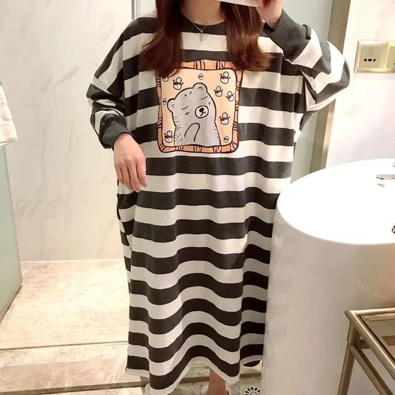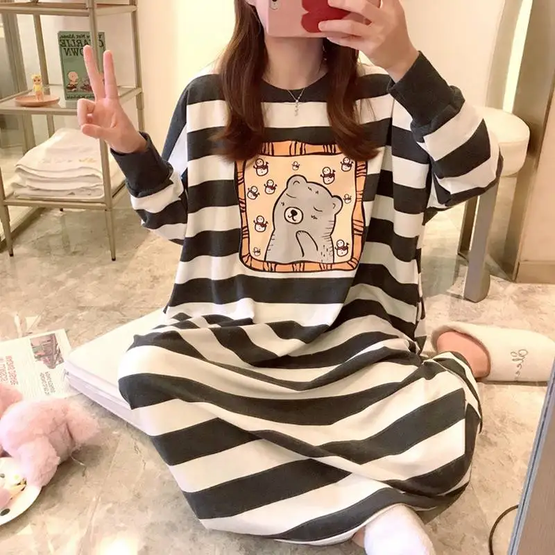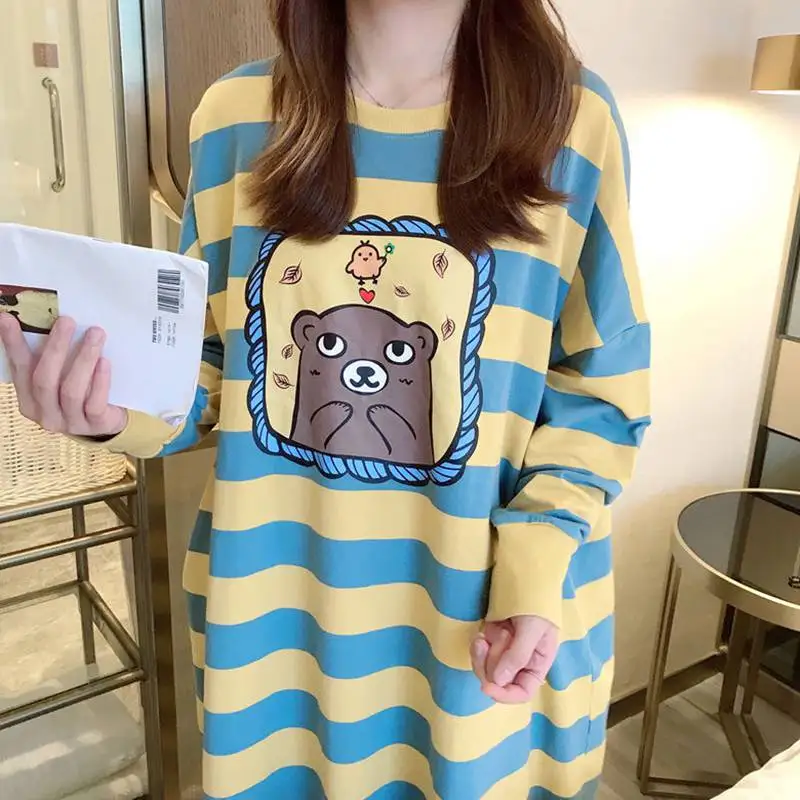 Сезон зима-весна; Рубашка для женщин с длинными рукавами, одежда для сна в виде персонажей из мультфильмов, с принтом в полоску Домашняя одежда женские пижамы Sleepdress для женщин
