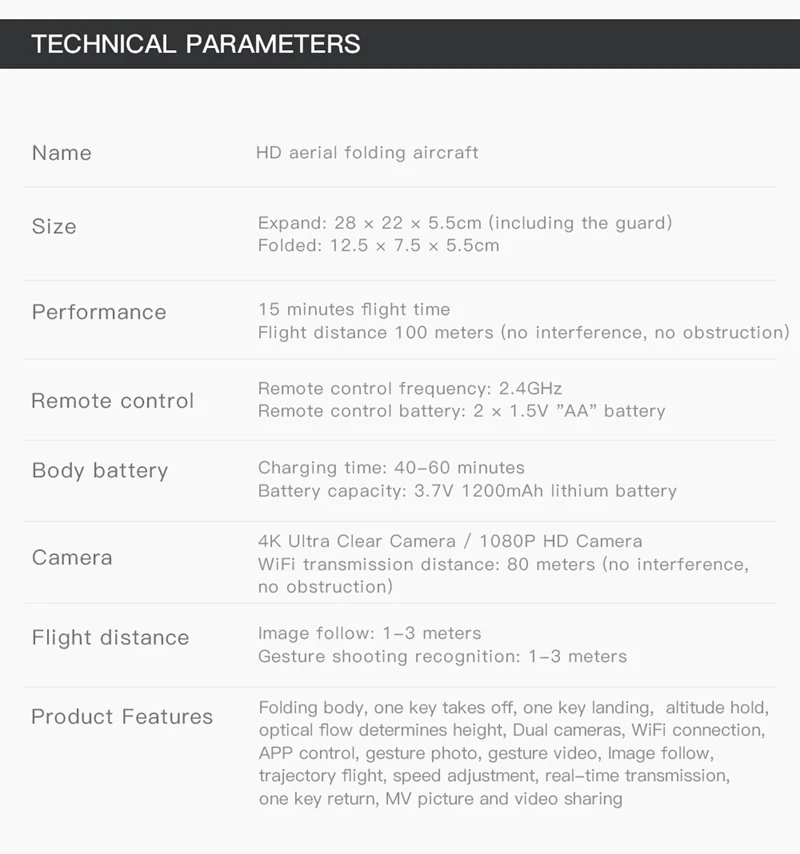 Параметры продукта4K4K ProСледуйте изображению❌1-3 метраКоснитесь полета✔✔Объектив камеры120 °120 °Ручная съемка жестов/видеозапись❌1-3МетровФото/видео поделиться✔✔Частота кадров20 кадров в секунду20 кадров в секунду