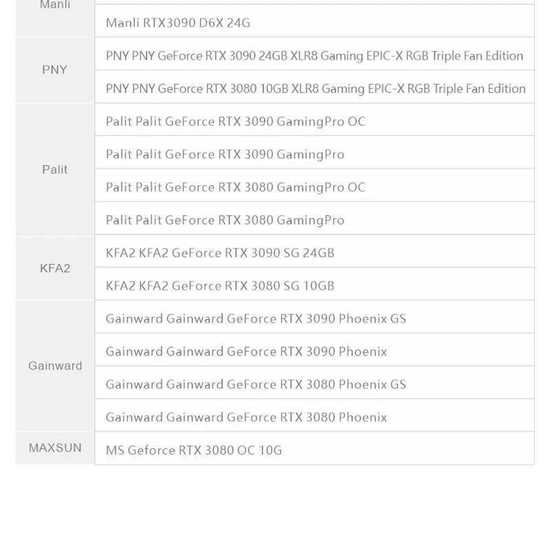 ZOTAC игровой Geforce RTX 3080 AMP HoloZOTAC игровой Geforce RTX 3090 TRINITY OC 24 goZOTAC игровой Geforce RTX 3080 TRINITY OC 10 goGALAXY Geforce RTX 3080 OC 10GGALAXY Geforce RTX 3090 OC 24GGALAXY Geforce RTX 3090 EX GamerGALAXY Geforce RTX 3080 EX GamerLeadTek RTX 3090 LIFE ES 24GLeadTek RTX 3080 LIFE ES 10GManli RTX 3080 D6X 10GManli RTX 3090 D6X 24GPNY gepre RTX 3090 24 go XLR8 Gaming-RGB Triple Fan EditionPNY gepre RTX 3080 10 go XLR8 Gaming-RGB Triple Fan EditionPNY gepre RTX 3090 Gaming PRO OCPNY gepre RTX 3080 Gaming PRO OCKFA2 Geforce RTX 3090 SG 24 goKFA2 Geforce RTX 3080 SG 10 goУсиление pour Geforce RTX 3090 Phoenix GSКоэффициент усиления Geforce RTX 3090 PhoenixУсиление pour Geforce RTX 3080 Phoenix GSКоэффициент усиления Geforce RTX 3080 PhoenixMAXSUN Geforce RTX 3080 OC 10G