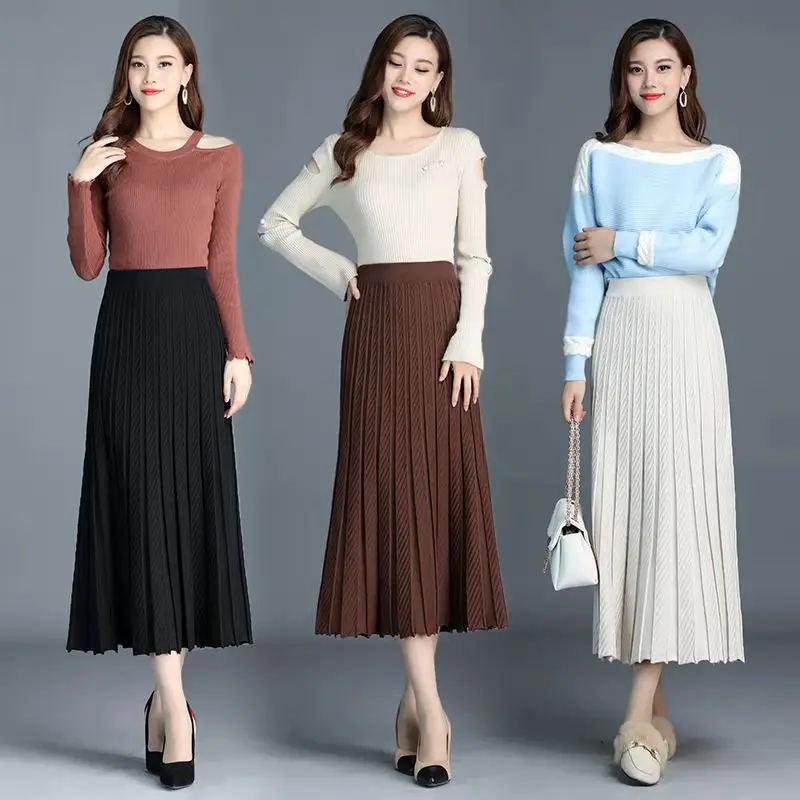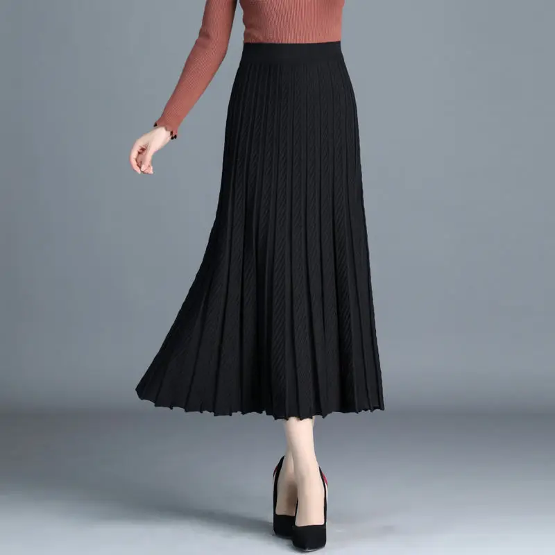 Плотная теплая женская вязаная плиссированная юбка, осенне-зимняя вязаная юбка-свитер с эластичной завышенной талией, длинная трапециевидная черная юбка миди