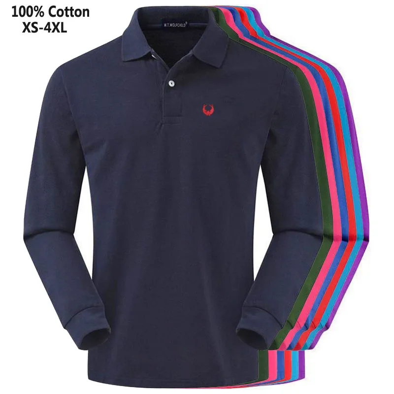 Мужские рубашки-поло, из 100% хлопка, с длинным рукавом, повседневные, с отворотами, весна-осень, XS-4XL