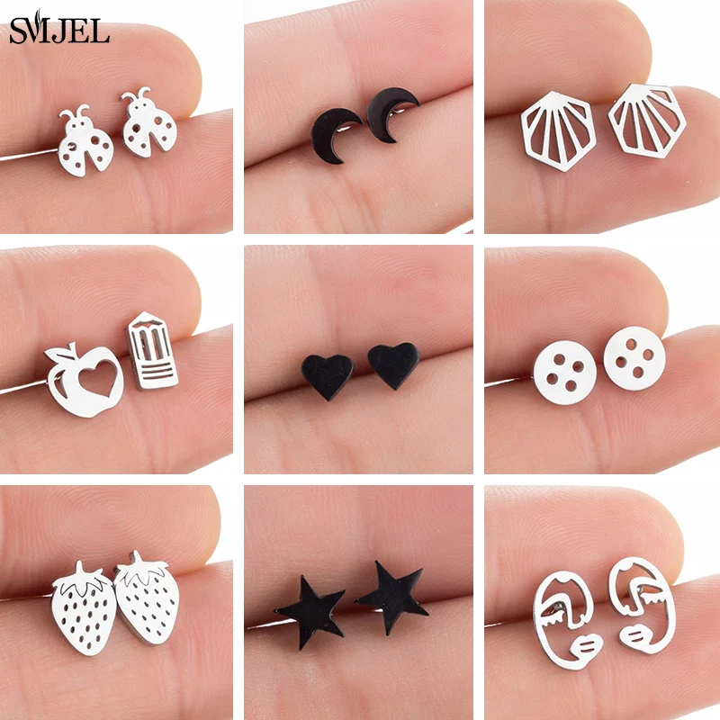 Серьги из нержавеющей стали, сердца, для женщин, мужчин, панк, черная звезда, луна, пуговица в виде фрукта, серьга-гвоздик модная, ювелирные изделия, подарок
