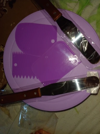 Está bien por el precio que tiene. La mesita llegó un poco ondilada, espero que con el peso de la tarta se pone recta. Las espatulas metalicas perfectas. Otros son de plástico y pequeñas.