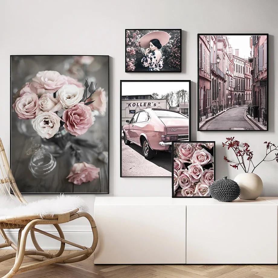 Картина на холсте с изображением розы, машины, улицы, девушки