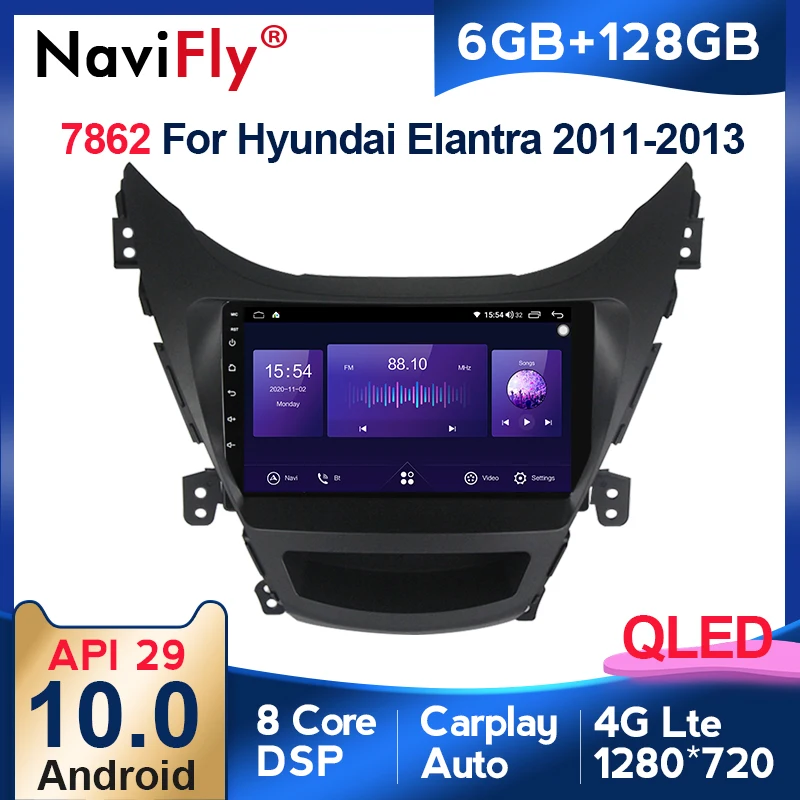 Автомобильный мультимедийный проигрыватель NaviFly Android10 4GLTE 6 + 128G, 1280*720QLED экран, для Hyundai Elantra 2011-2016 Octa Core DSP 4GLTE