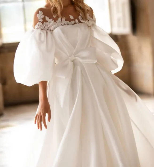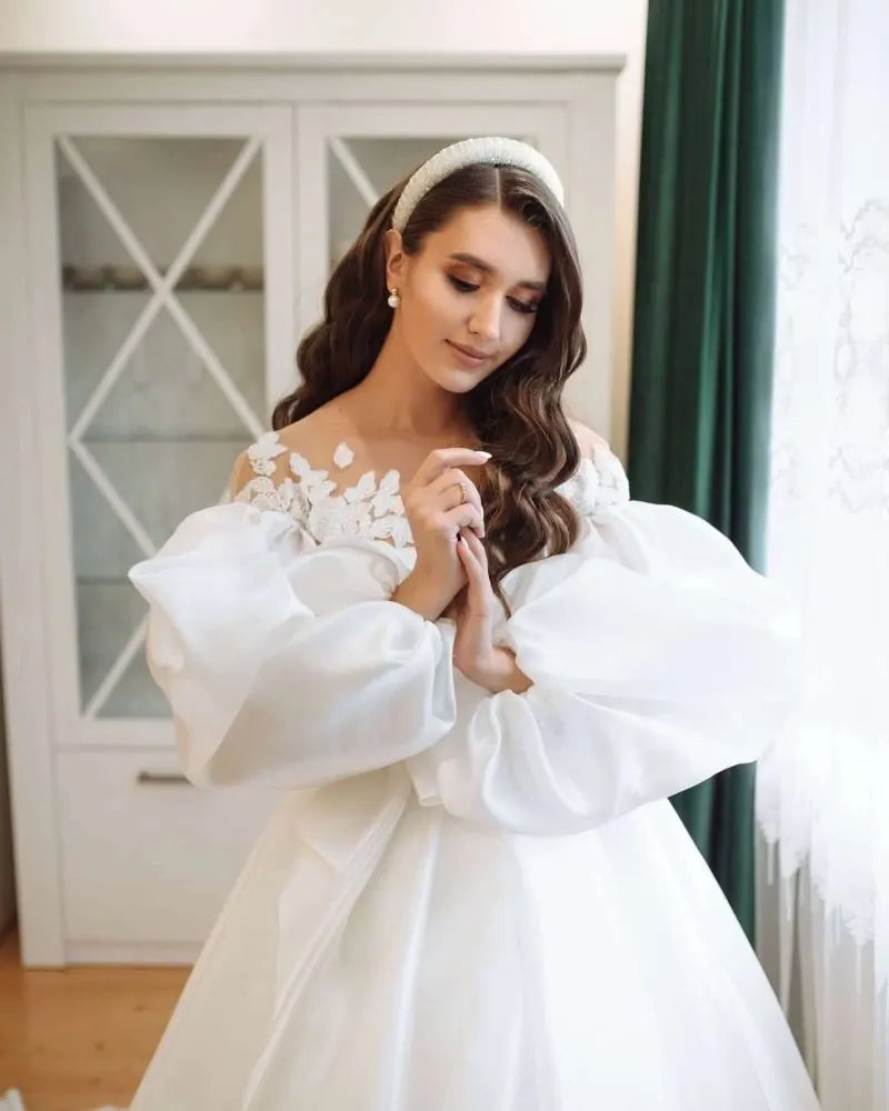 Платье свадебное с рукавами-фонариками, с аппликацией
