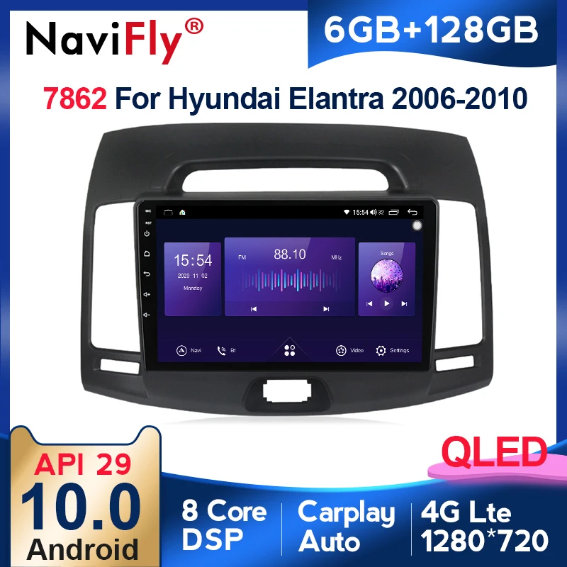 Автомобильный GPS-навигатор NaviFly Android10, 4GLTE 6 + 128G, 1280*720QLED экран, для Hyundai Elantra 4 HD 2006-2010, Восьмиядерный