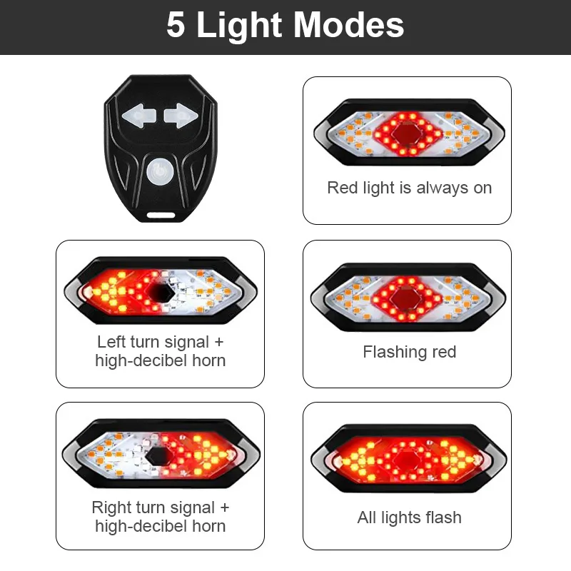 2. Установите ваш собственный светильник режим: 5 светильник вариантов режима: поворот направо + Высокая децибел динамик/повернуть налево + Высокая децибел динамик/красный светильник always on/красный светильник мигающий/все мигать. Вы можете изменить различные режимы в соответствии с вашими потребностями и поводами, чтобы получить лучший опыт освещения и защитить вас.