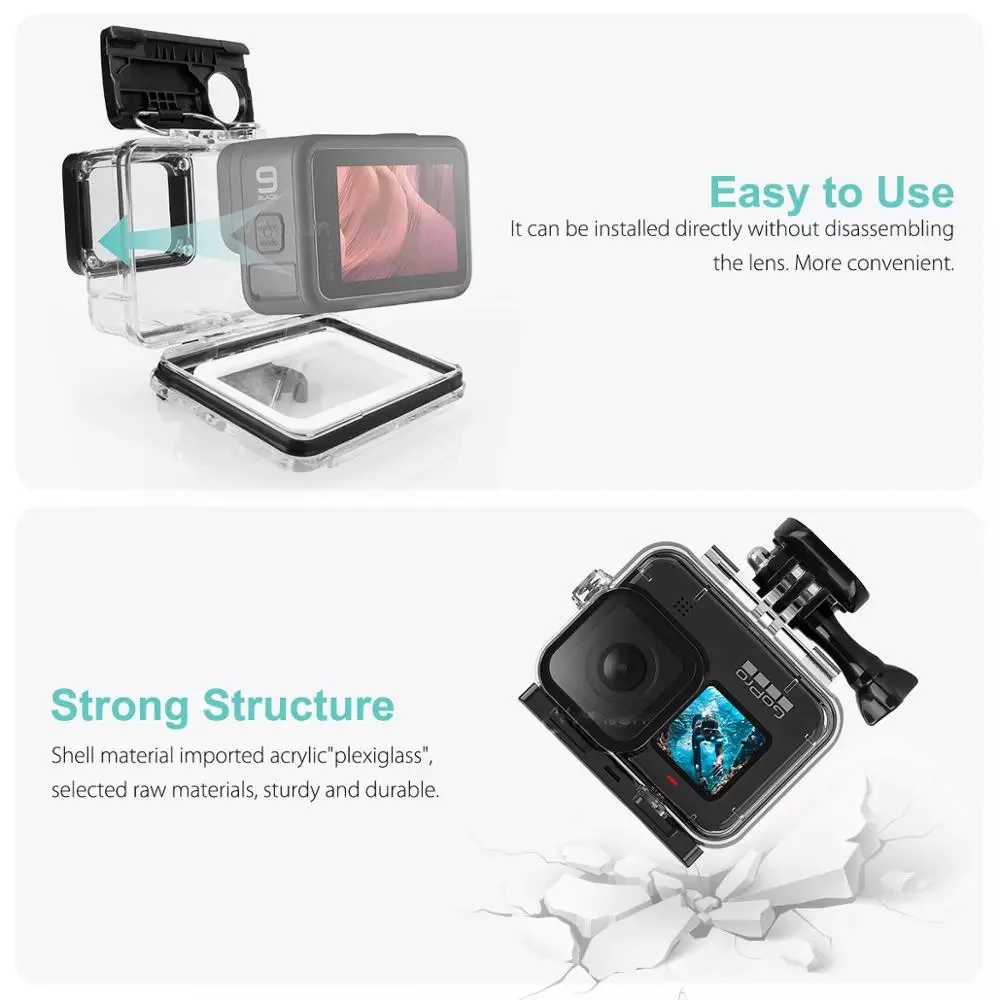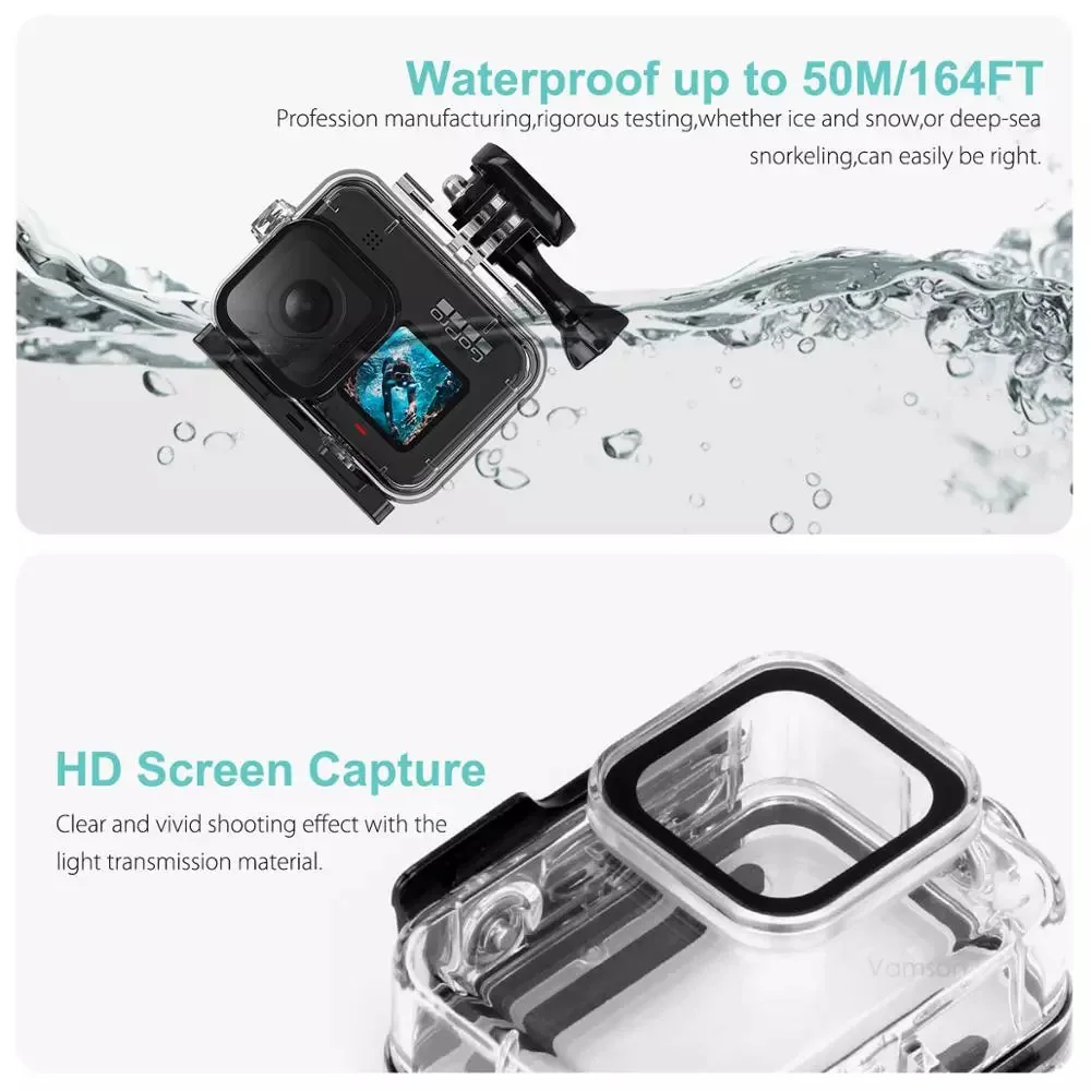1. Водонепроницаемость до 164фт/50 м. Обеспечивает максимальную четкость изображения выше и под водой.2. С этим водонепроницаемым корпусом вы можете идеально использовать камеру 50 м под водой; Водонепроницаемое покрытие против серфинга не повлияет на ваше движение и фотографический эффект;3. Линзы сделаны из высокоорганического закаленного стекла, могут поддерживать хорошую фотосъемку;4. Подходит для GoPro Hero 9 10 черной камеры.5. Простота установки не нужно разбирать Дизайн объектива делает его более удобным в использовании водонепроницаемый чехол6. Компакт-диск с защитой от отпечатков пальцев Дизайн: Навигация специальный материал из нержавеющей стали 316, широкая головка кнопки, увеличьте площадь контакта между водонепроницаемой кнопкой чехол и кнопкой камеры, Защитите кнопку камеры.7.Magenta,fuchsine и фиолетовый фильтр для объектива можно использовать на глубине 5 м-25 м и может исправить отклонение цвета в различном качестве воды.