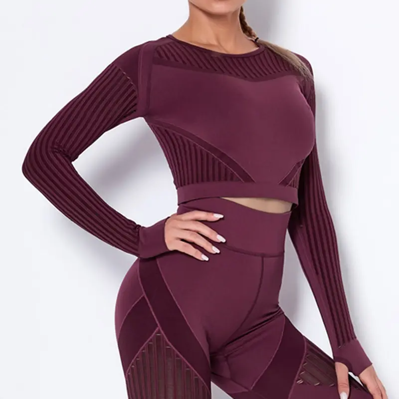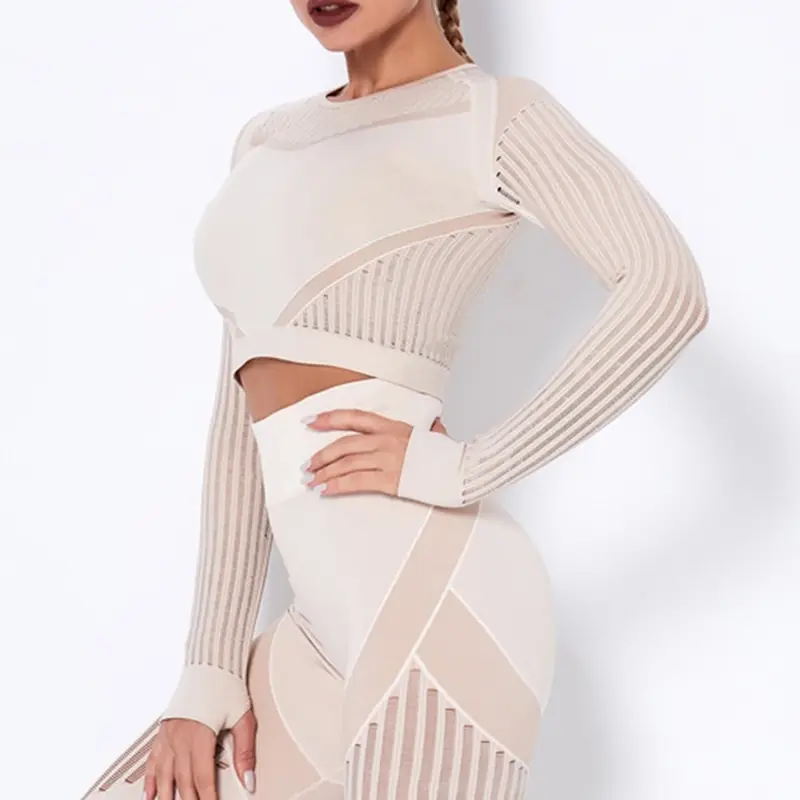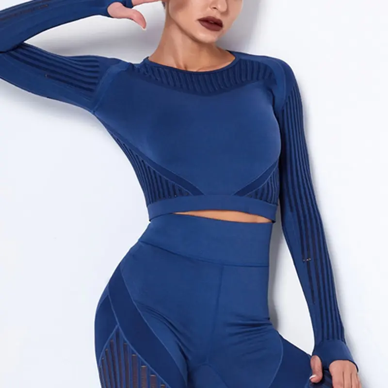 Женский бесшовный спортивный костюм для йоги, леггинсы для фитнеса, Укороченная рубашка с вырезами и длинным рукавом
