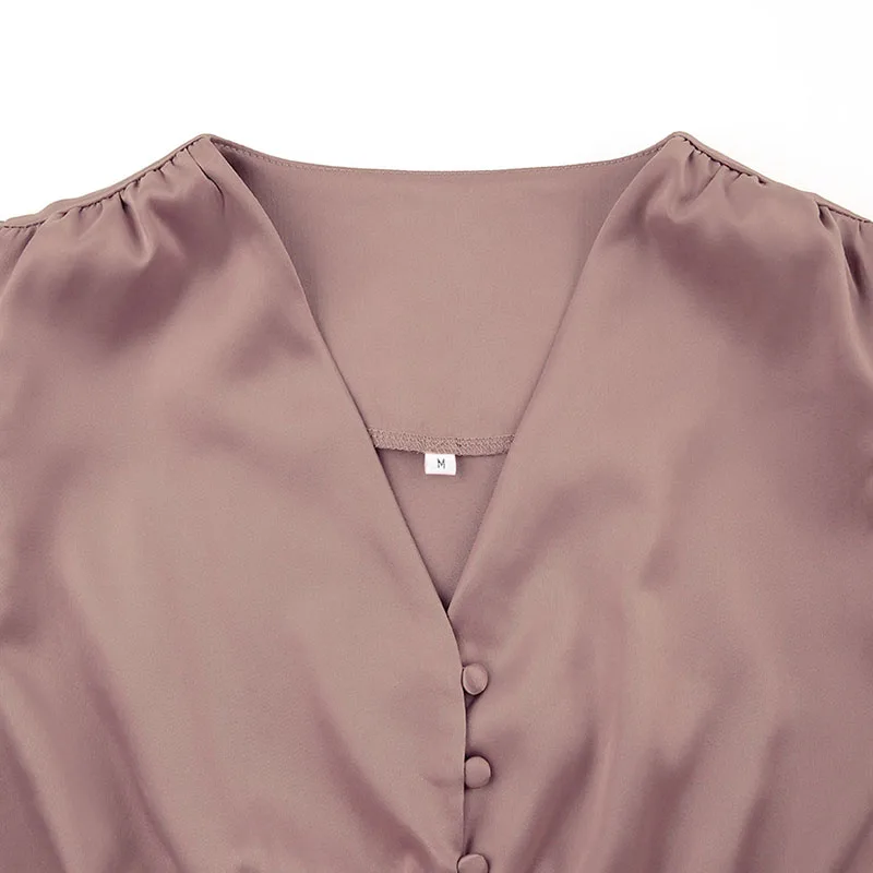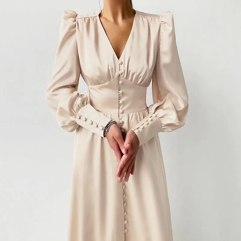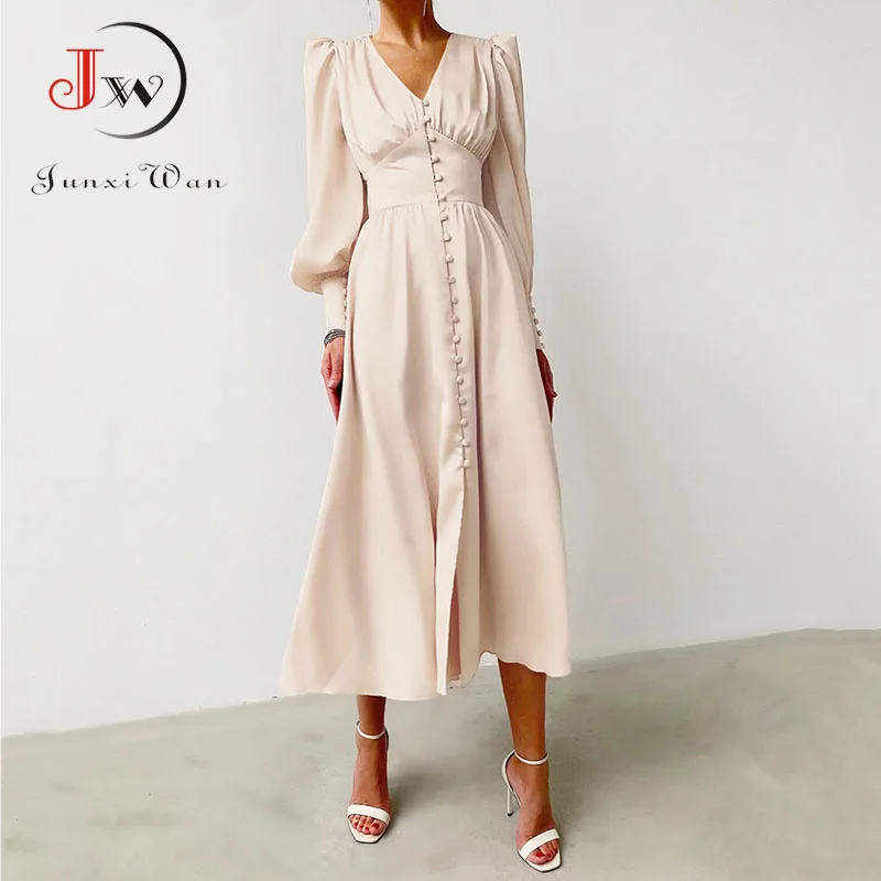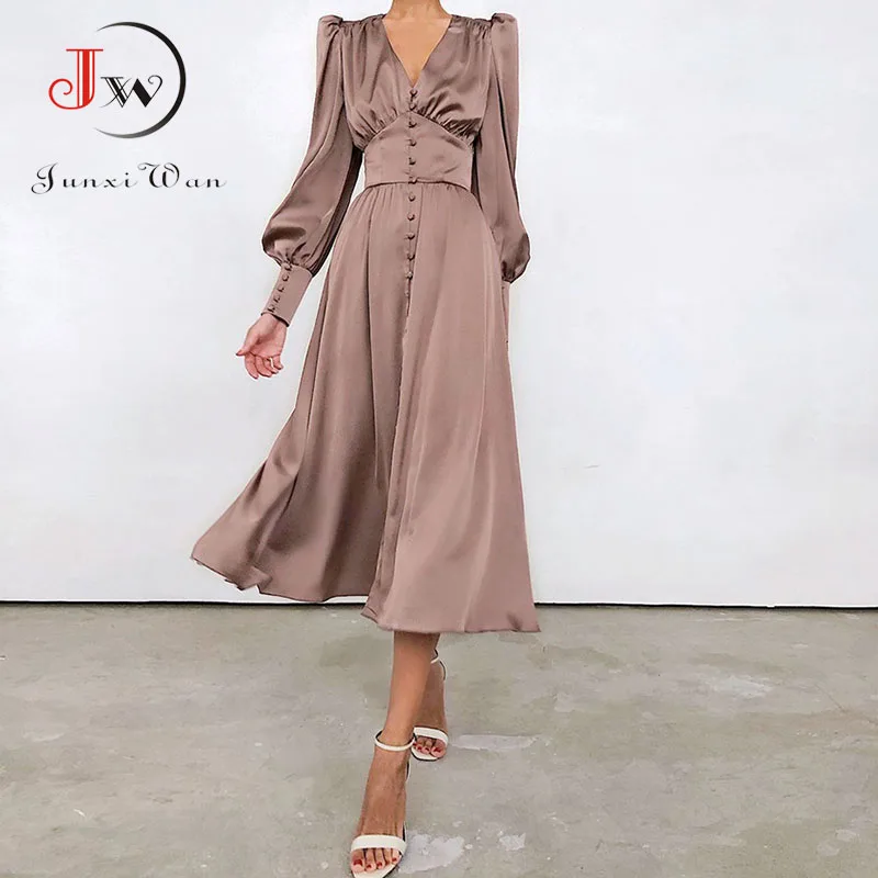 Платье-трапеция женское атласное с рукавами-фонариками, элегантное однотонное офисное вечернее длинное платье-трапеция с V-образным вырезом, в винтажном стиле