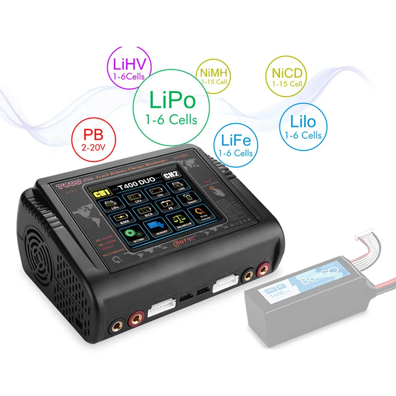Двухканальное зарядное устройство HTRC T400 с сенсорным экраном, 200 Вт, DC 400 Вт