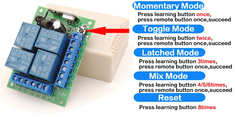 Режим переключения: Нажмите кнопку «A», реле будетРабота; Нажмите кнопку «A» снова, это реле будетСтоп. Режим блокировки:Нажмите кнопку «A», реле 1 будетРабота; Нажмите кнопку «B», реле 2 будетРабота, В то же время, реле 1 будетСтоп. Настройка Мгновенный режим: Нажмите кнопку обучения один раз, нажмите кнопку A один раз. Преуспейте Режим переключения: Нажмите кнопку обучения дважды, нажмите кнопку A один раз. Режим блокировки: Нажмите кнопку обучения 3 раза, нажмите кнопку A один раз. Преуспейте Смешанный режим: Пресс кнопку обучения 4/5/6 раз, Пресс кнопку один раз. Добиться успеха 2 канала + 2 канала: Мгновенный режим + режим переключения 2 канала + 2 канала: Мгновенный режим + блокированный режим 2 канала + 2 канала: режим переключения + режим блокировки Сброс Нажмите кнопку обучения 8 раз, добиться успеха.