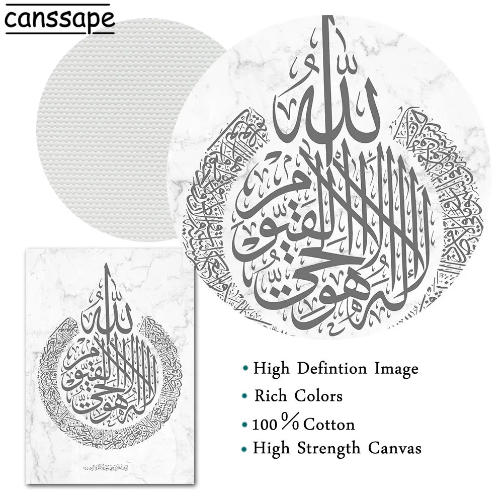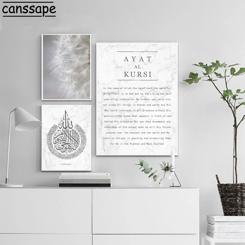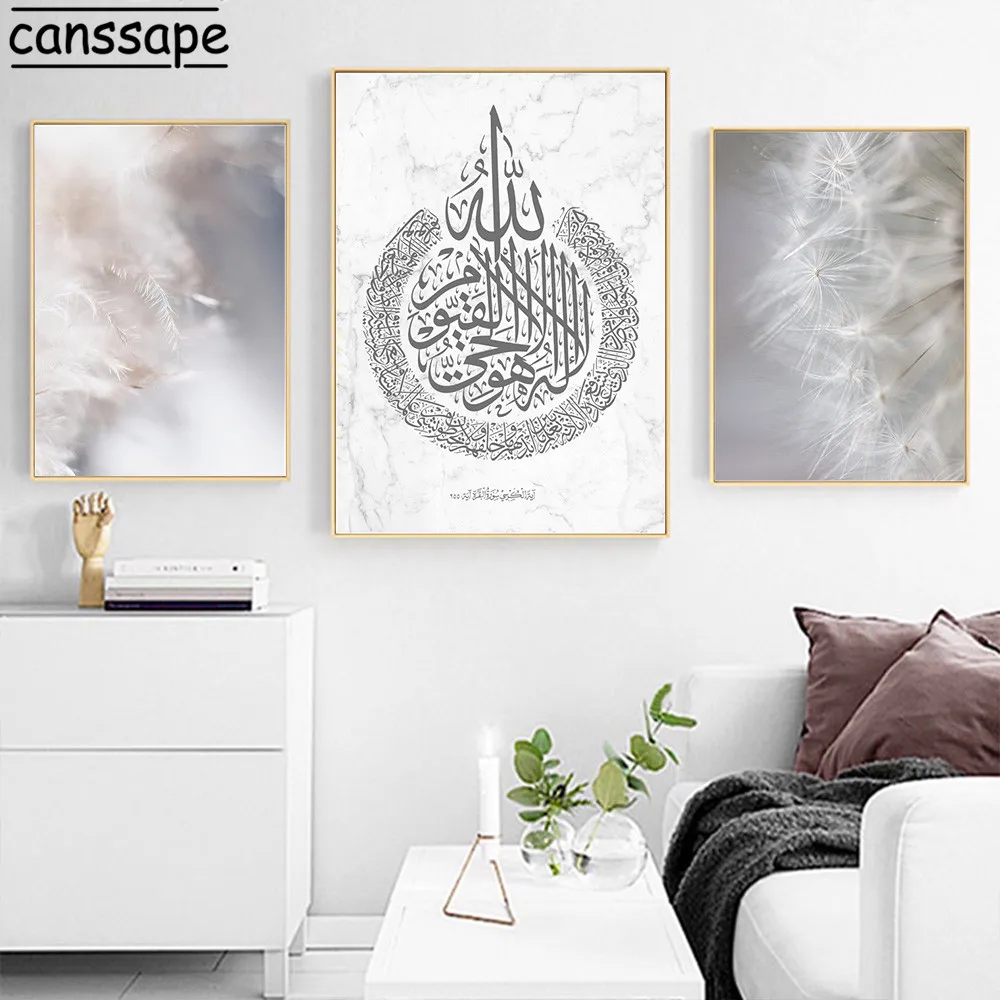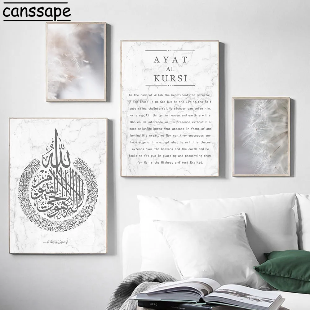 Айат аль-Kursi исламский холст с каллиграфией живописи, печать на арабском плакат Мрамор изображения Одуванчик Wall Art Картины домашний декор