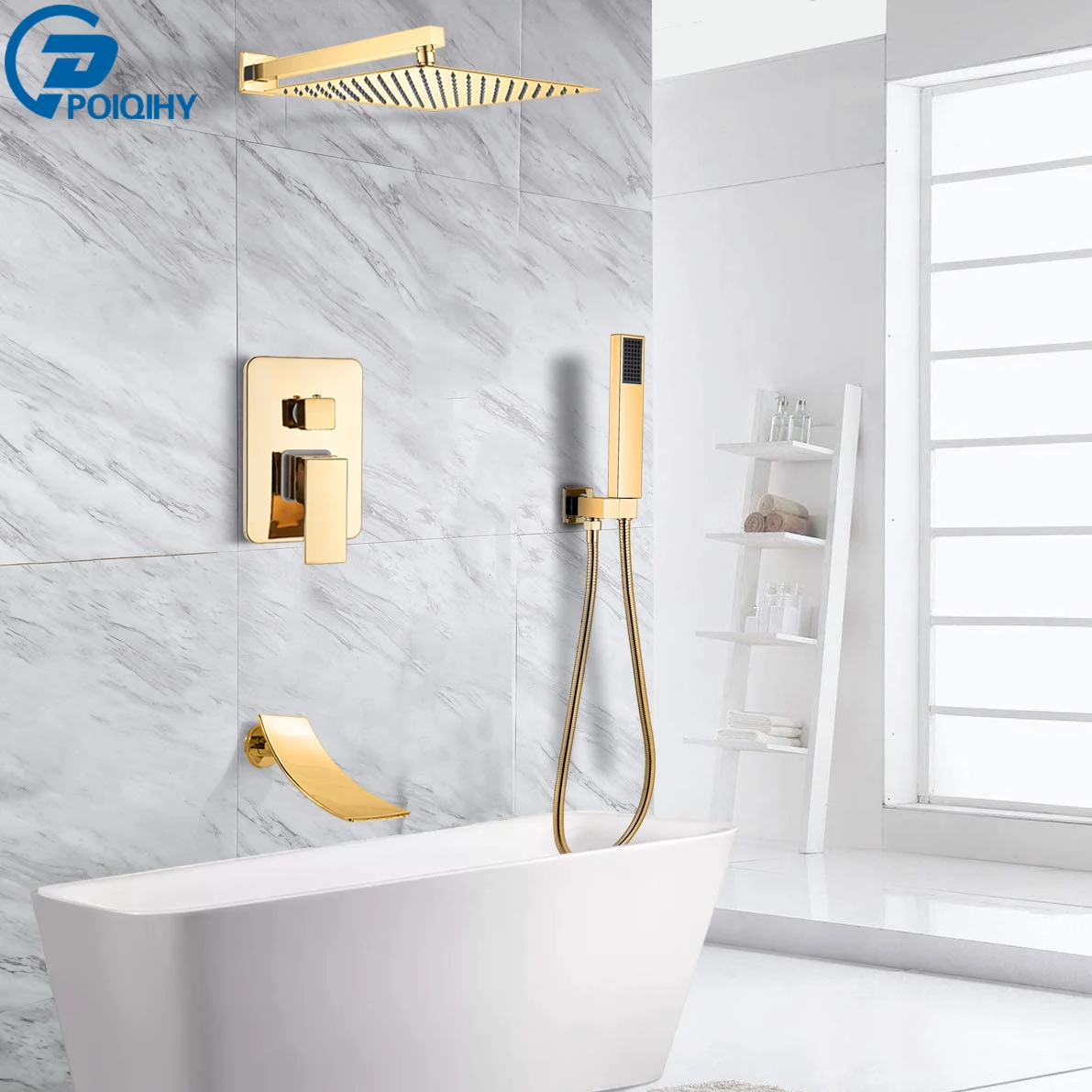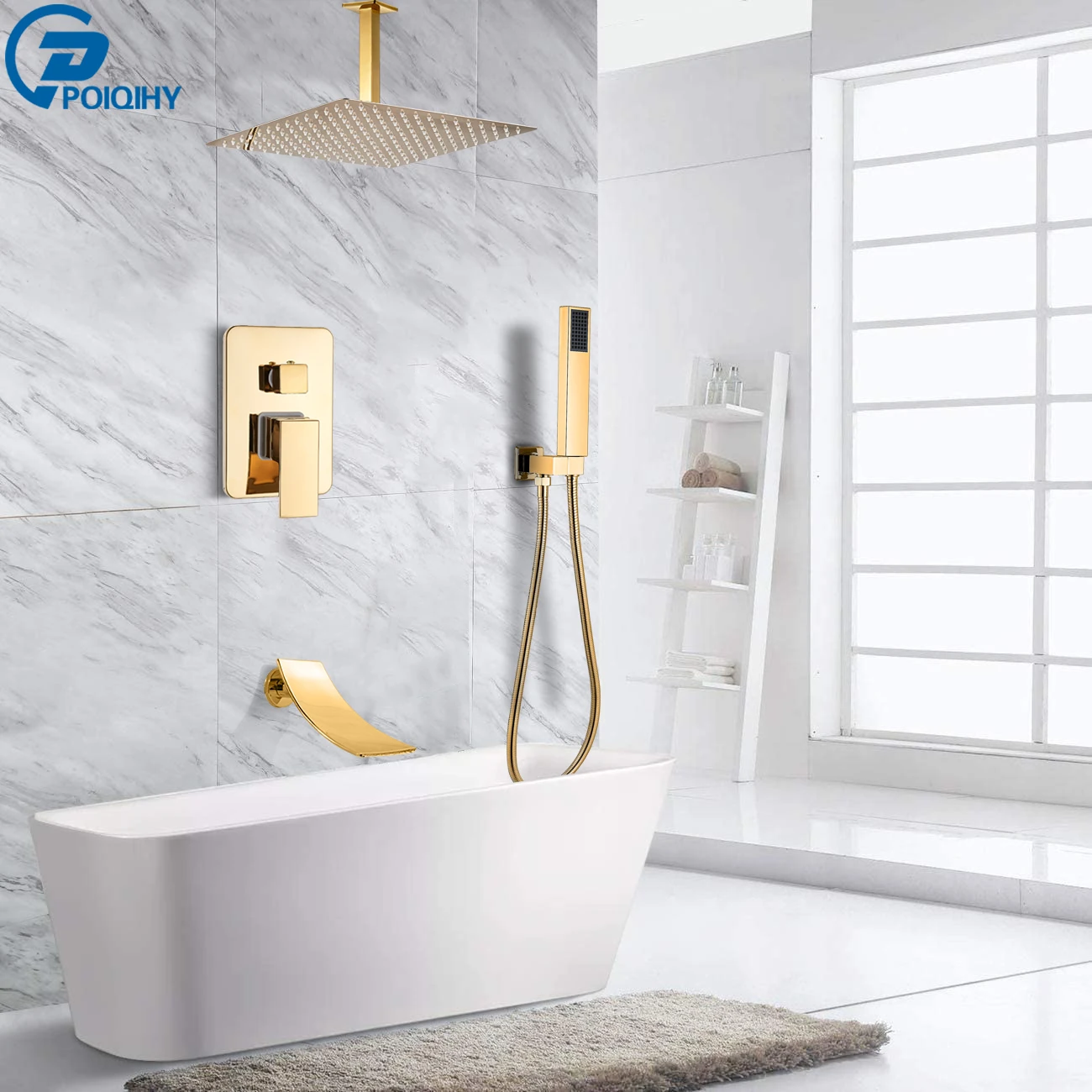 POIQIHY Золотой смеситель для душа настенный водопад для ванной комнаты смеситель для душа скрытый набор для ванны 3 способа управления клапаном