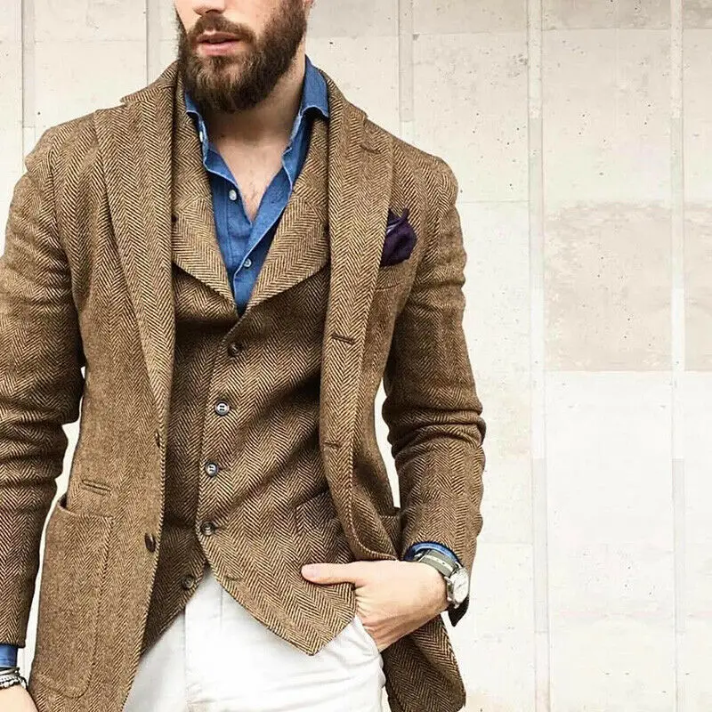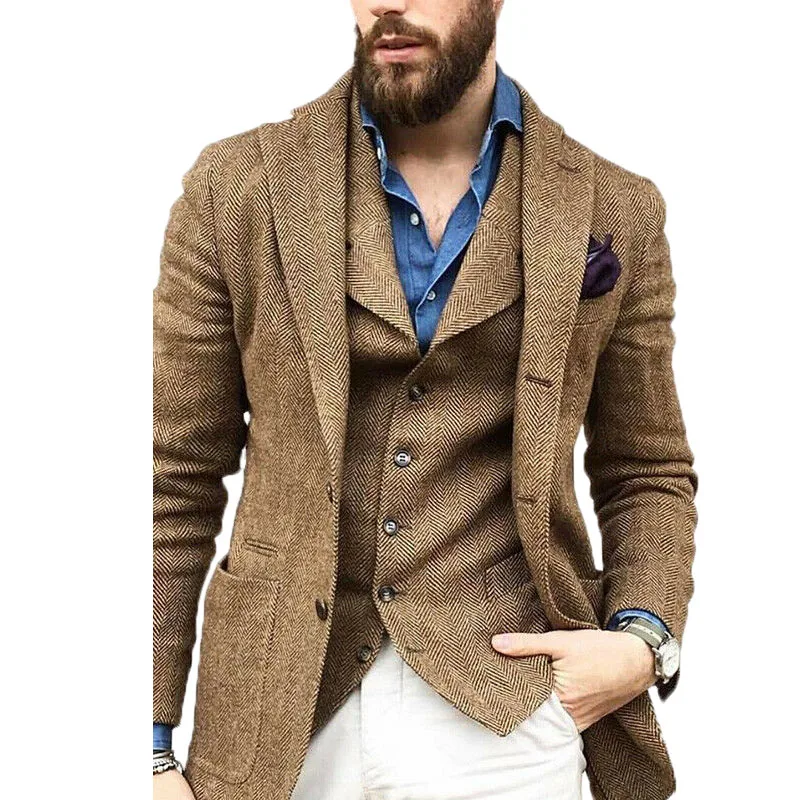 Мужской деловой костюм цвета хаки, приталенный твидовый пиджак с вырезом в елочку и отложным воротником, модель смокинг, костюмы жениха для мужчин, свадьба, 2 предмета, пиджак и жилет