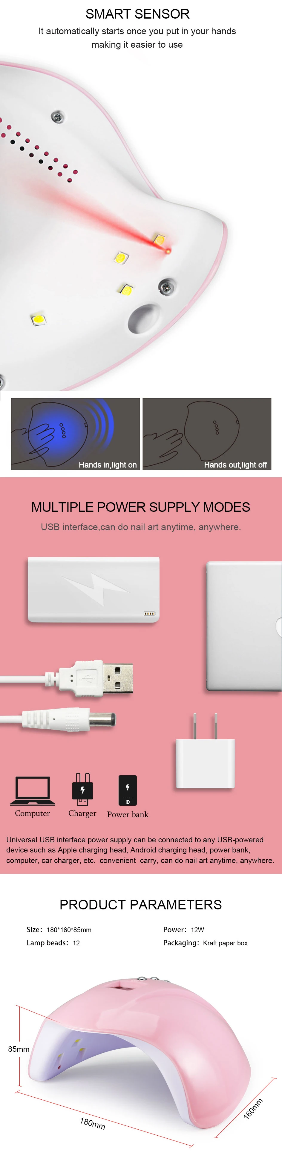 Особенности:Модель с низким нагревом избавляет вас от боли при отверждении гелейСолнечные ногти, удобный контакт с глазами, relleve burning sensationgДвойной источник света (365 + 405 нм) светодиоды для лечения УФ гл/строитель/LED гель12 светодиодов со съемным размещением, без мертвой зоны, более бесплатно50,000Hrs срок службыРежим зарядки: зарядка через USB