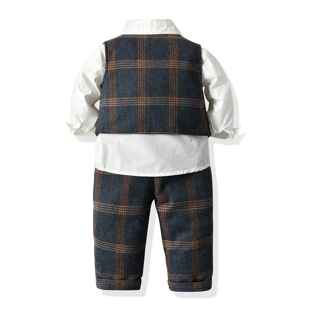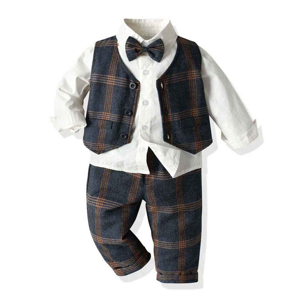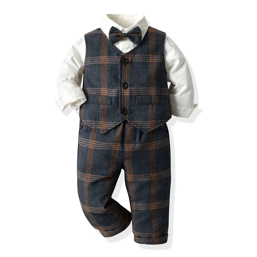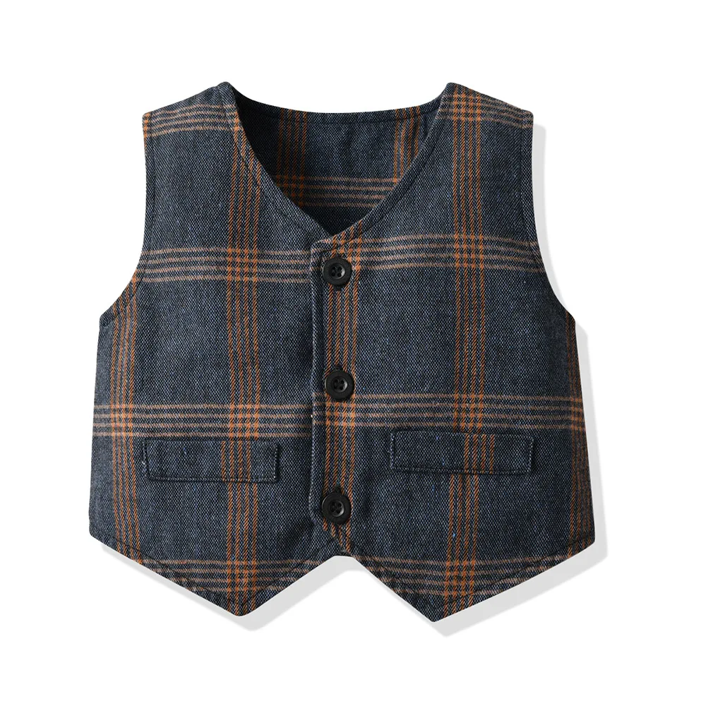 Весенняя одежа для малышей, комплекты в клетку для мальчиков, одежда для маленьких детей, строгая вечерние костюм; Жилет, рубашка и брюки, комплект одежды из 3-х предметов, для младенцев, детский осенний комплект верхней одежды От 1 до 7 лет