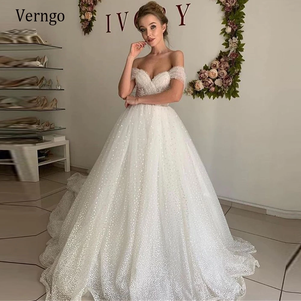 Элегантное свадебное платье принцессы Verngo, блестящее Тюлевое ТРАПЕЦИЕВИДНОЕ ПЛАТЬЕ с открытыми плечами, жемчужинами и шлейфом, 2021