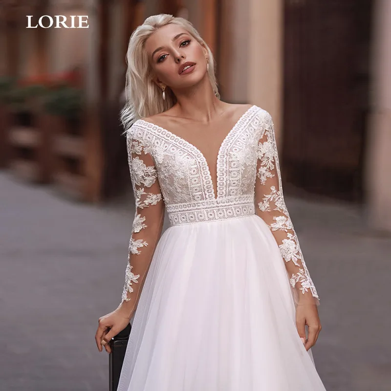 Свадебное платье LORIE с буфами из фатина, кружевное свадебное платье с длинным рукавом и V-образным вырезом, платье невесты, скромное свадебное платье