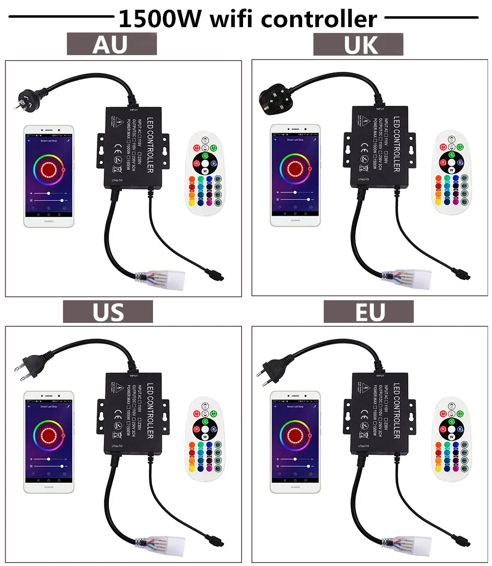 Это новый контроллер RGB высокого напряжения WIFI.Один WIFI контроллер 1500 Вт обычно контролирует максимум 100 метров RGB 60 ламп.Он может быть контролируется смартфон приложение и смарт аудио, а также может контролироваться при помощи инфракрасным ПДУ с 24 кнопками дистанционный пульт.При помощи инфракрасного излучения, входит ПДУ с 24 кнопками дистанционный пульт имеет 16 государственных цветов на выбор, 4 динамических режимов (с аккумулятором, трехцветная прыжок, трехцветный градиент, семь цветов градиент, семь цветов прыжок) простое и понятное управление одним ключом, с функцией отключения памяти, удобное и практичное. Избегайте повторных настроек.