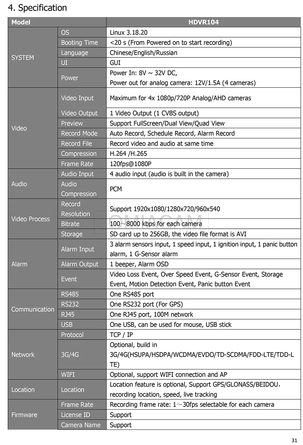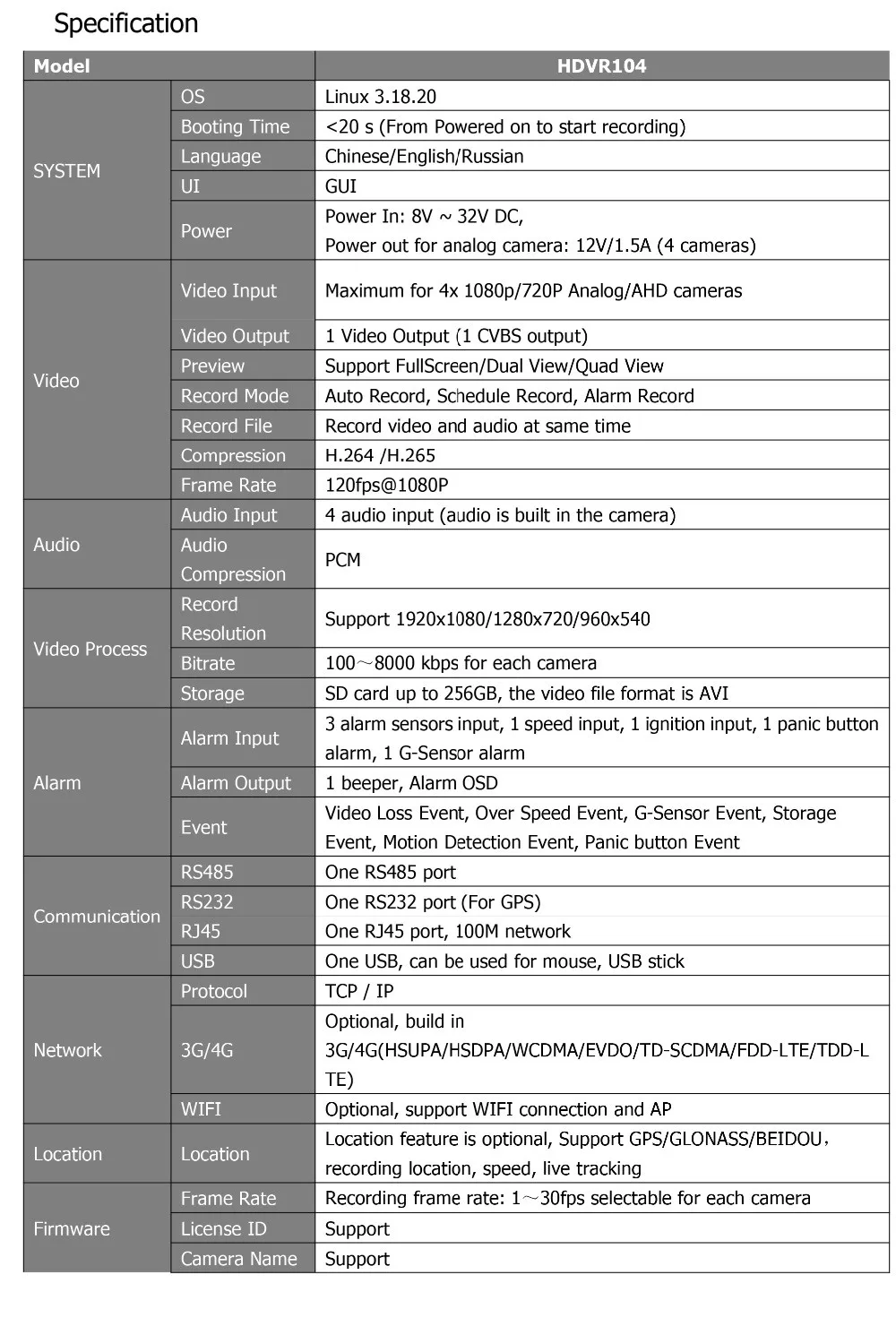 Модель: SDVR004PRO СистемыОперационная система: Linux 3,0Время загрузки: менее 30 секунд (включение в видео)Язык системы: английский/китайскийРабочий интерфейс: графический интерфейс Видео1. Видео вход:2. Поддержка четырехканальной 720P AHD HD камеры записи (посылка не включает камеру)3. Поддержка четырехканального 720P AHDP AHD HD (посылка не включает камеру)4. Видеовыход: 2 видеовыхода (1 HDMI выход, 1 CVBS выход)5. Разрешение видео: Дополнительно 1960*1080, 1280x720, 960x540 (в соответствии с моделью камеры)6. Режим записи: запись загрузки, запись времени, запись сигнала тревоги7. Частота кадров: 120 кадров в секунду @ 1080P8. Просмотр видео: поддержка одного изображения/двух фотографий/четырех фотографий9. Стандарт сжатия видео: H.265 /h.264 АудиоАудиовход: четыре аудио входа (если кабель интерфейса авиационной головки, камера требует встроенного пикапа, посылка не включает камеру)Сжатие звука: PMC формат (согласно пикапу, не входит в посылка)Метод записи: Поддержка одновременной записи звука и видео Обработка и хранение изображенийЛокальная запись: Поддержка 1960*1080, 1280x72 0/960x540 разрешениеСкорость передачи видео: каждая камера поддерживает 100 ~ 8000 Кбит/сПамять данных: 1 sd-карта максимальная поддержка 256G Позвоните в полицейскийВход сигнала тревоги: 3 входа сигнала тревоги, 1 вход скорости, 1 сигнал зажигания, 1 g-сенсор, поддержка 1 кнопка аварийной ситуации (посылка базовой модели не включает аварийную кнопку, gps-модуль, при необходимости, пожалуйста, выберите модель GPS)Сигнал тревоги: 1 зуммер, сигнальная Выходная линия, будильник и т. д.Триггер тревоги: сигнал о потере видео, тревога о превышении скорости, сигнализация о столкновении, космическая сигнализация для хранения, обнаружение движения, сигнализация с дистанционным управлением Интерфейс связиИнтерфейс RS232: 1 Интерфейс RS232Сетевой интерфейс RJ45: 1 RJ45 100 м сетевой интерфейсUSB 1 USB, используется для обновления системы, внешней мыши и других операций Глобальная система позиционирования (GPS)Международная стандартная Глобальная система позиционирования (GPS): (базовая версия не включает gps-модуль, если вам нужна эта функция, пожалуйста, выберите модель с gps-модулем)Поддержка GPS/ГЛОНАСС, запись в реальном времени географических координат, данных скорости и беспроводной загрузки,