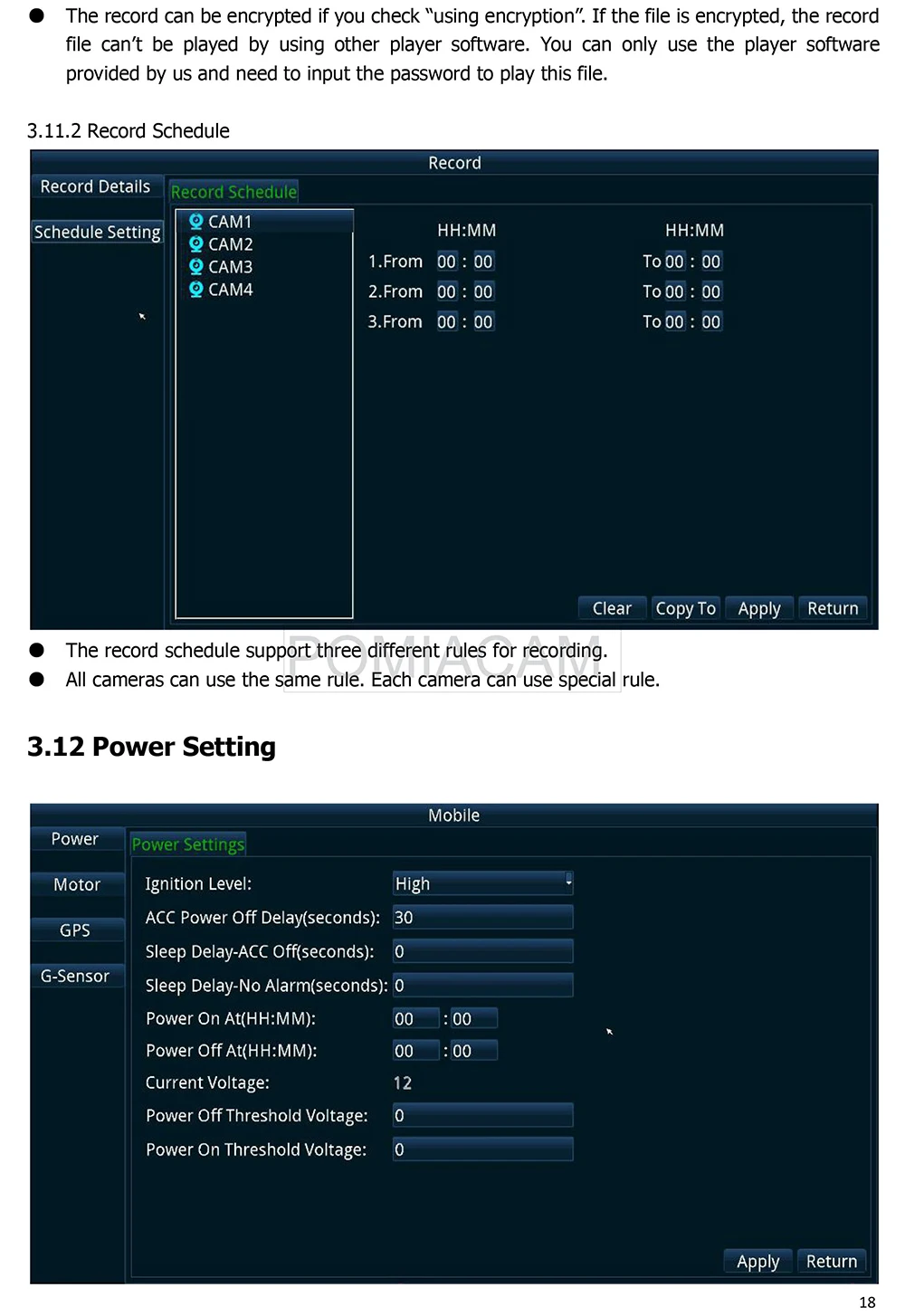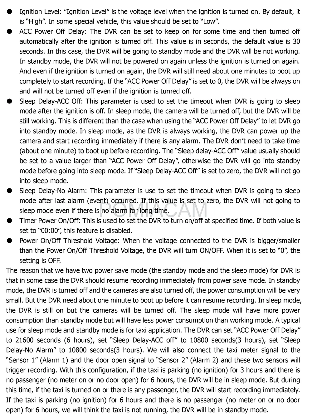 · Видеорегистратор может контролировать напряжение батареи после выключения зажигания и автоматически переходить в режим сна, когда напряжение ниже указанного уровня.