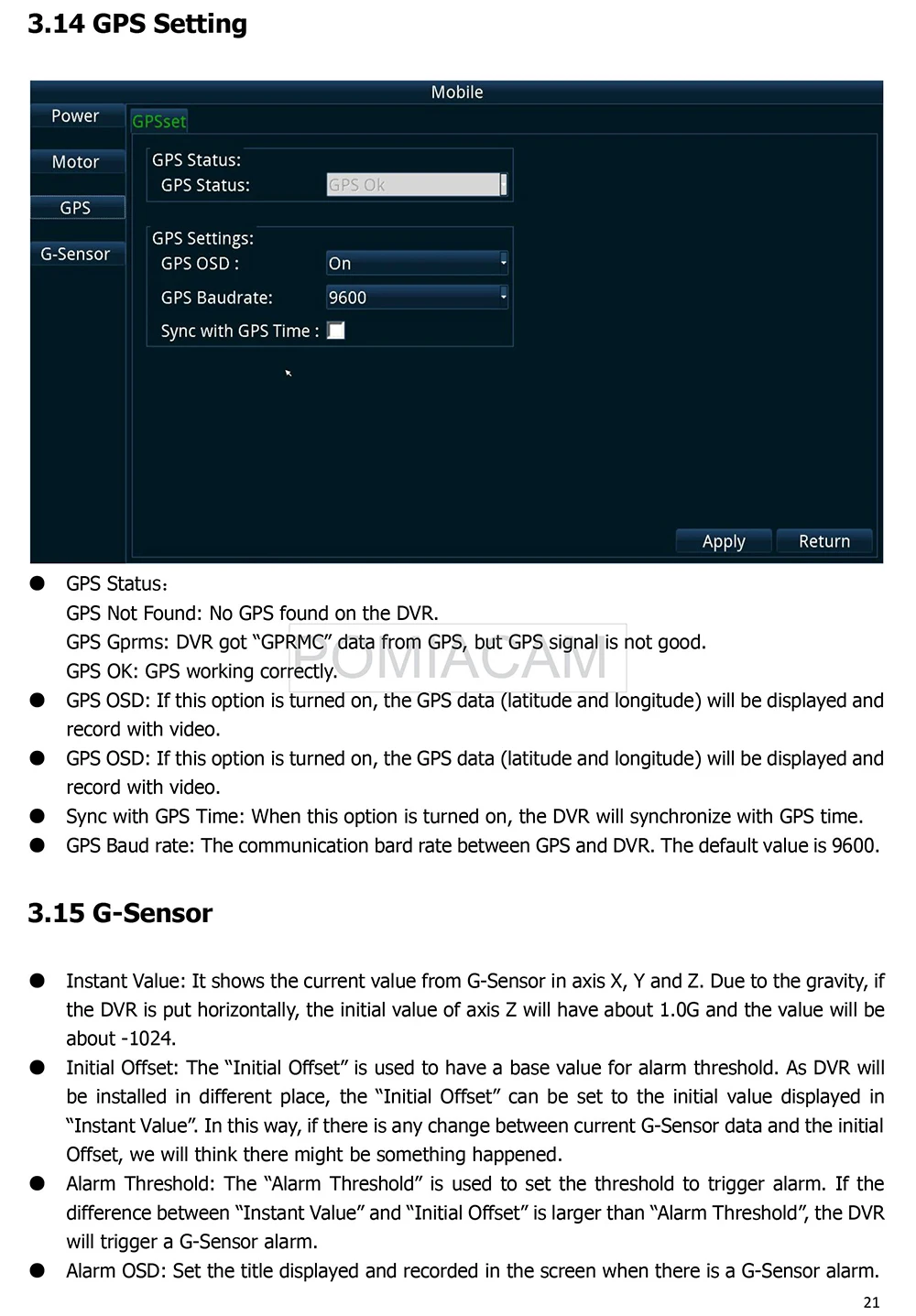 (Необходимо выбрать модуль GPS/4G) АкселерометрG-сенсор: поддерживает трехосевое обнаружение движения, а диапазон настройки пользователя-X, Y, Z координатыИнформация о программном обеспеченииЧастота кадров канала: каждая камера поддерживает 1 ~ 30 кадров в секунду по желаниюЗапись номера номерного знака: Поддержка редактирования и сопоставления номера номерного знакаНазвание камеры: Поддержка редактирования и изменения названий камерЦифровой водяной знак: Поддержка времени наложения, номера номерного знака, номера камеры, информации о положении, информации о скорости и т. д.Расписание; Ч/м/д и другие три вариантаАвтоматическое покрытие: Поддержка автоматического покрытияВоспроизведение изображения: Поддержка локального воспроизведения видео, управление видеофайлами по времени, будильник и т. Д.Скорость воспроизведения: Поддержка быстрого/медленного воспроизведения 1/32 ~ 32 раза Программное обеспечениеАнализ воспроизведения ПК: Воспроизводите Видеофайл на стороне ПК и одновременно анализируйте информацию о транспортном средстве в файлеПрограммное обеспечение для управления платформой CMSV6: поддержка предварительного просмотра/позиционирования в реальном времени/воспроизведения трека/выдача центральной команды/удаленное обновление системы/конфигурация параметров и т. д.