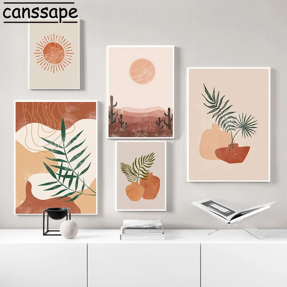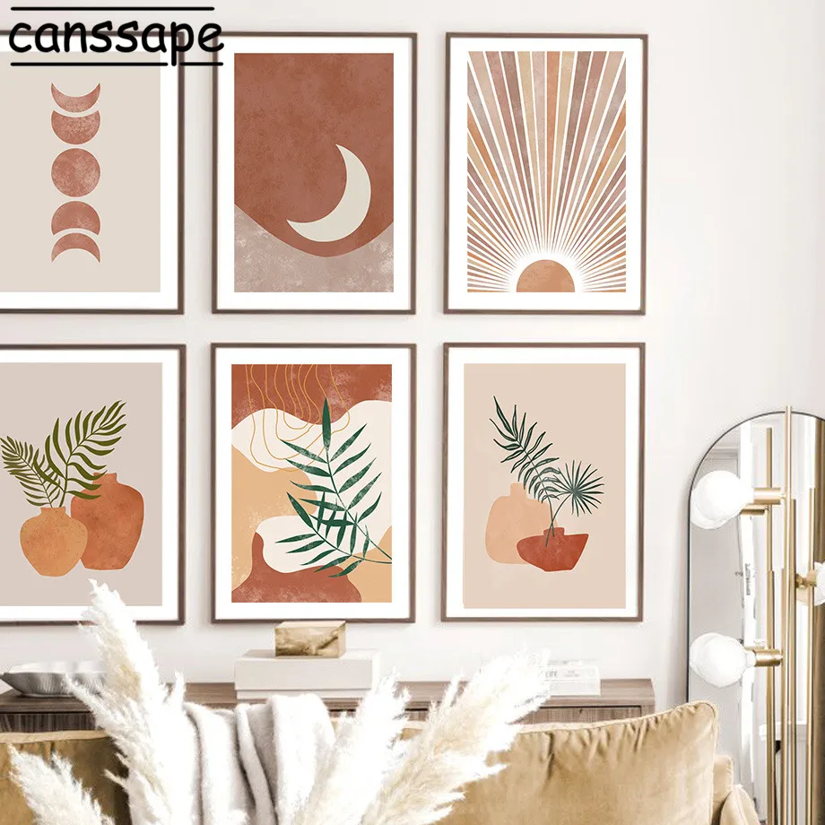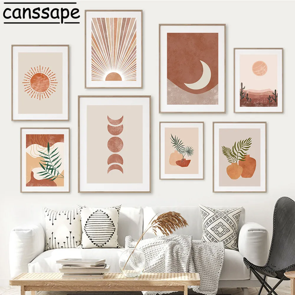 Постер в стиле бохо, ваза, растения, холст, принты, солнце, луна, плакаты, Минималистичная настенная живопись, Геометрическая Печать, Настенная картина в скандинавском стиле, домашний декор