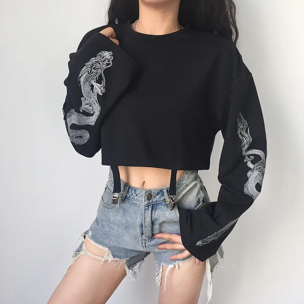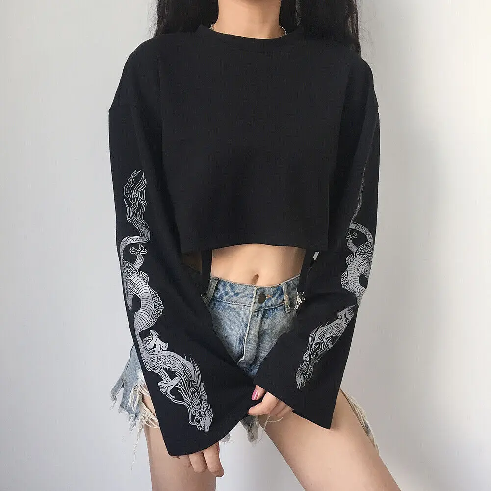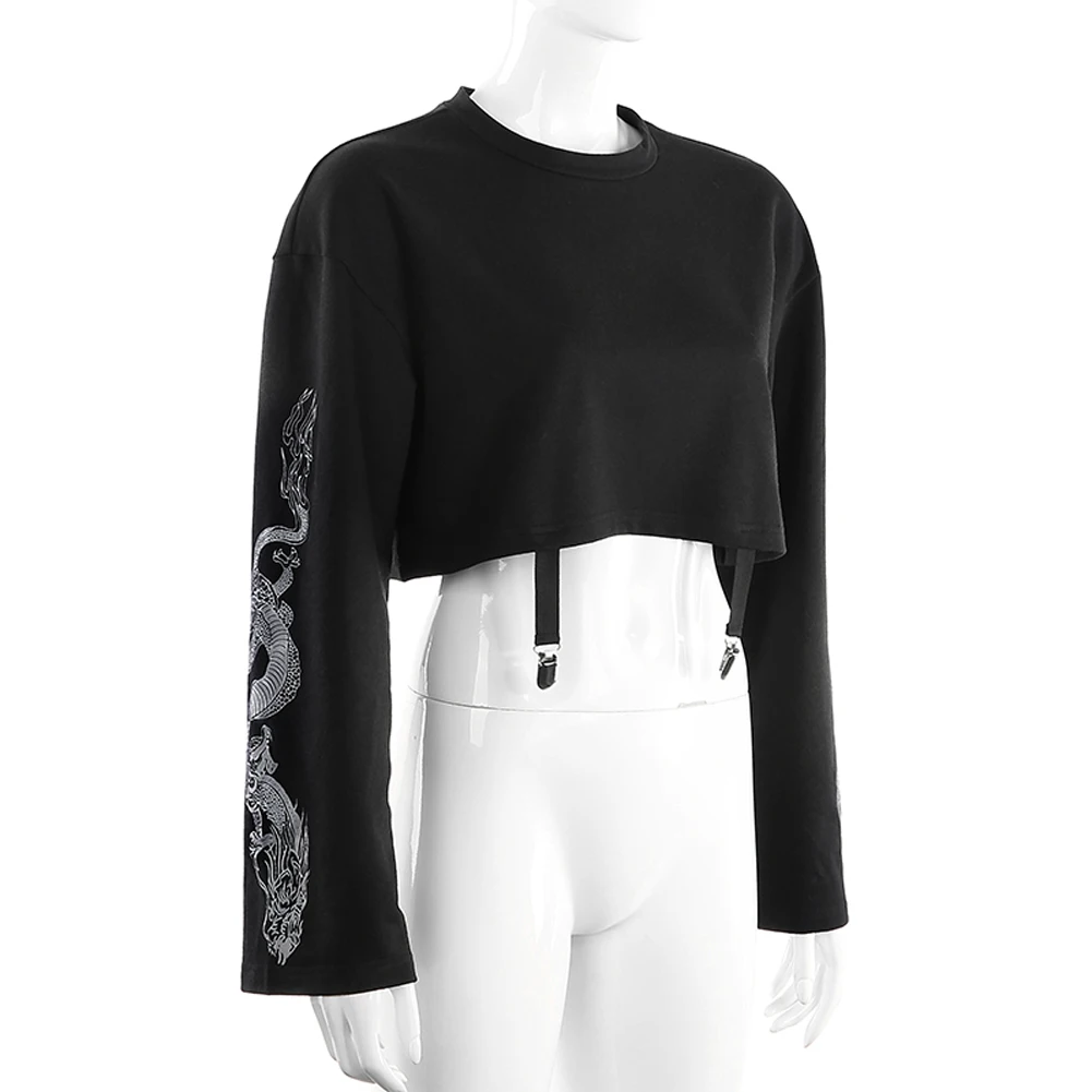 Футболка женская в готическом стиле, крутая футболка с длинным лямки на рукавах и круглым вырезом, черный кроп-топ с рисунком дракона, Осенний пуловер