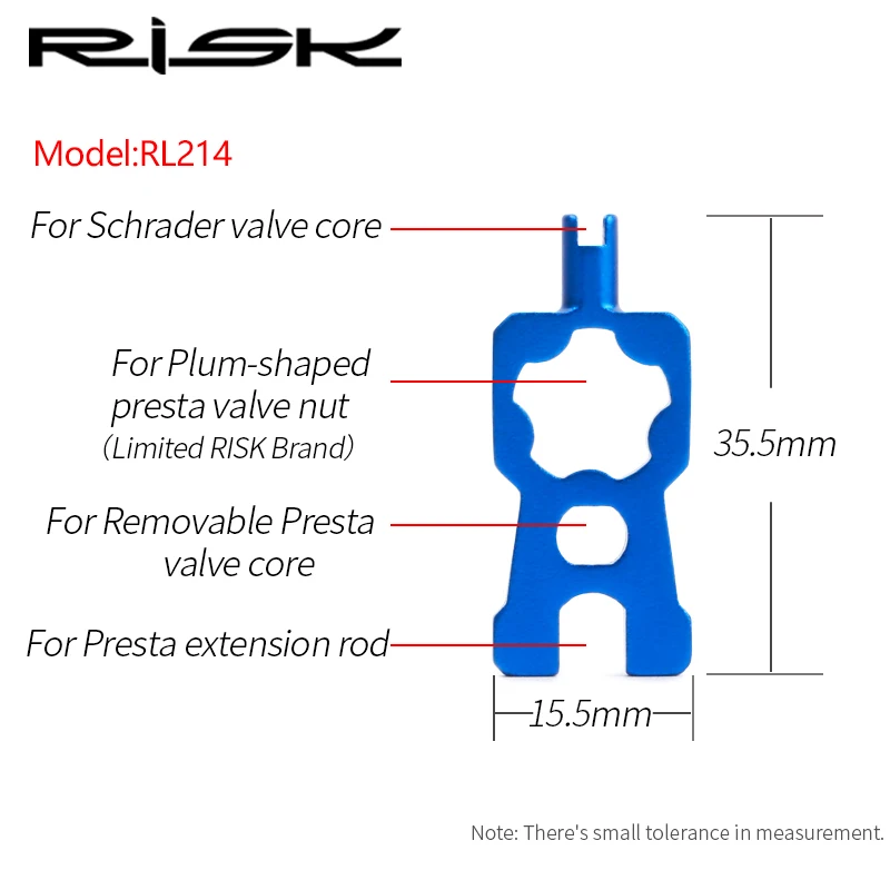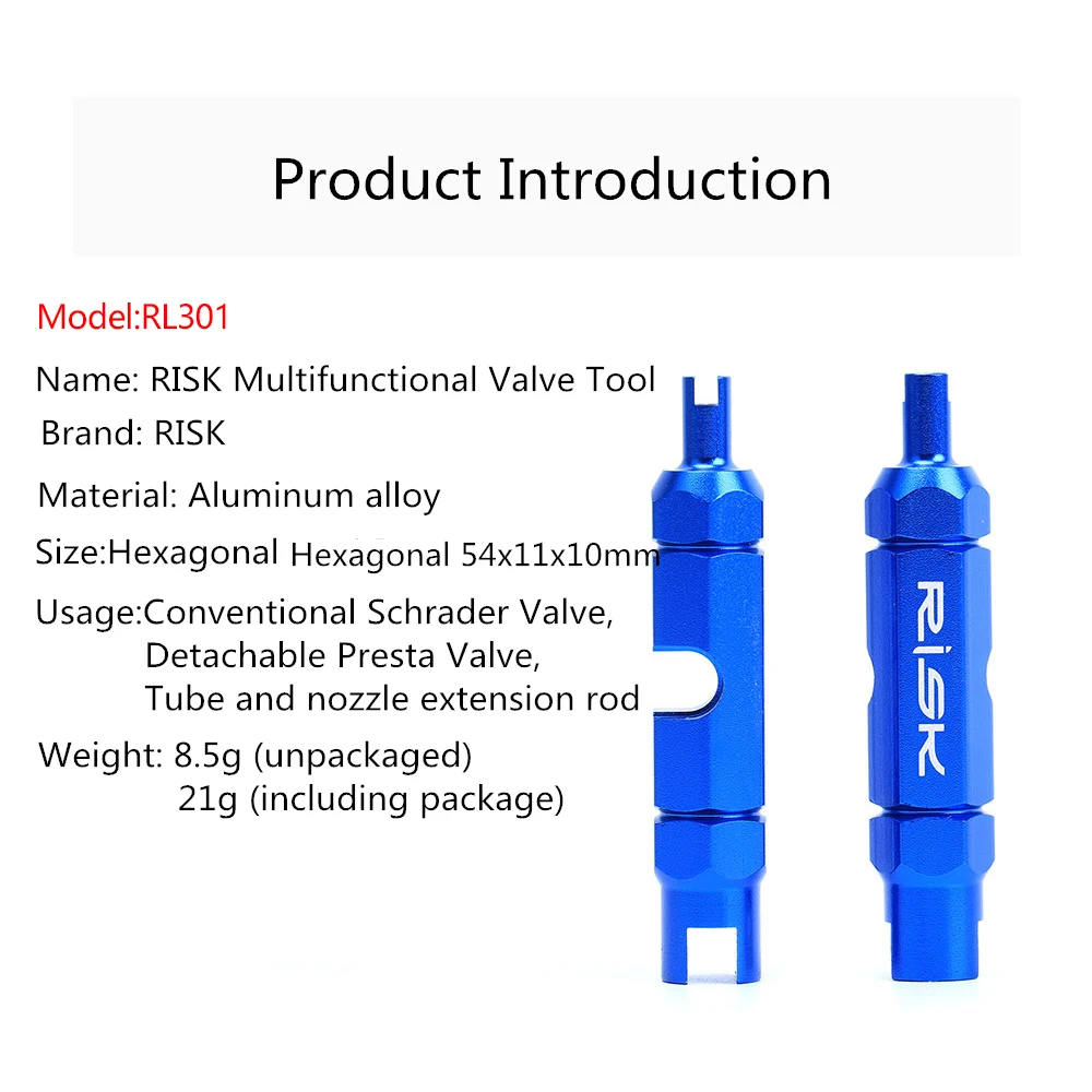 Название: многофункциональный инструмент для клапанов RISK бренд: RISK Материал: алюминиевый сплав Размер: шестигранный 54x11x10 мм Использование: Обычный клапан Schrader, Съемный клапан Presta, удлинитель трубки и сопла Вес: 8,5 г (без упаковки),21 г (включая упаковку)