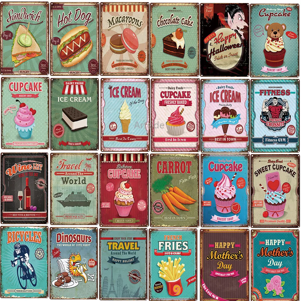 Кекс хот-дог мороженое гамбургер знаки олова металлическая пластина гладить Картины Кухня десерт магазин ретро потертый Настенный декор оловянные дощечки