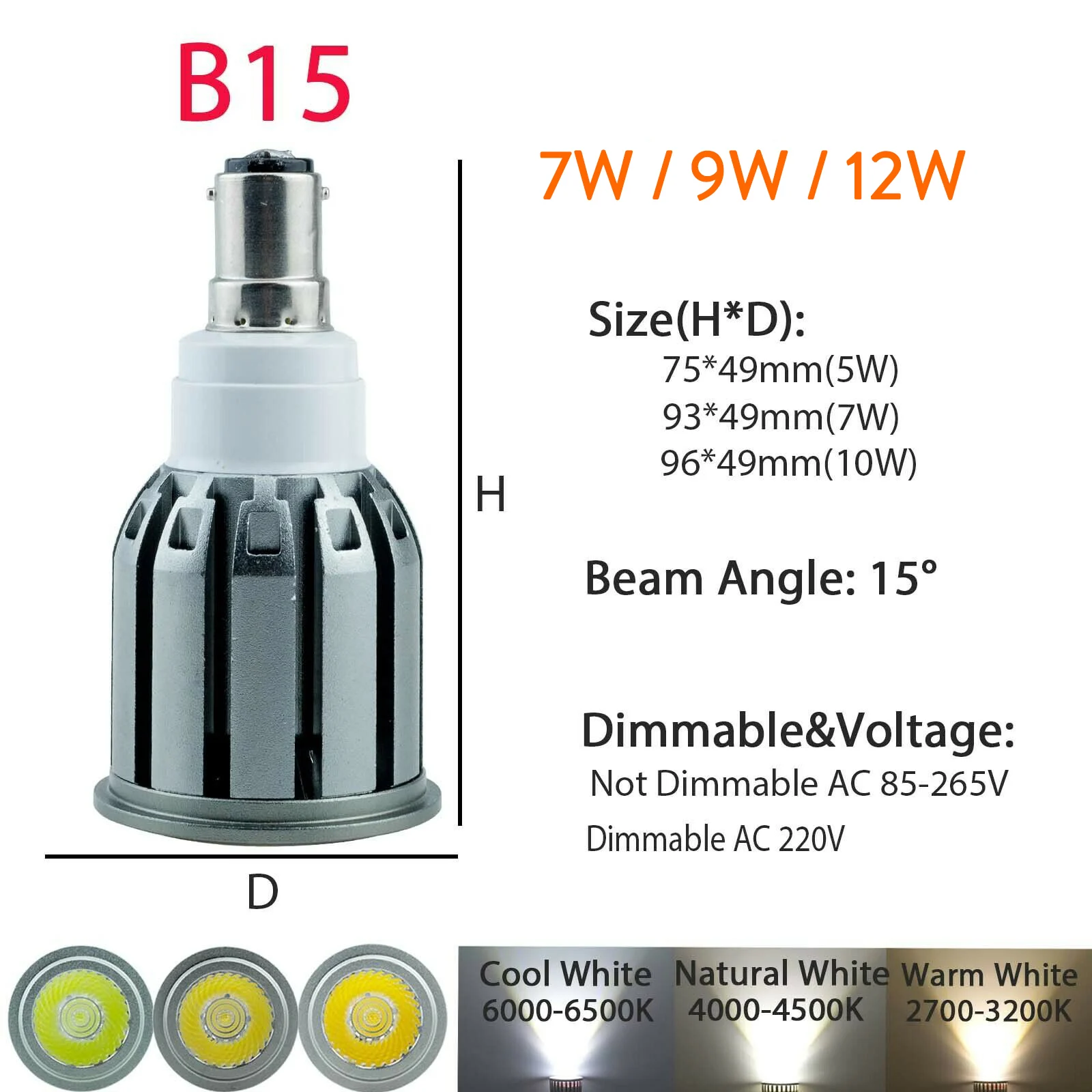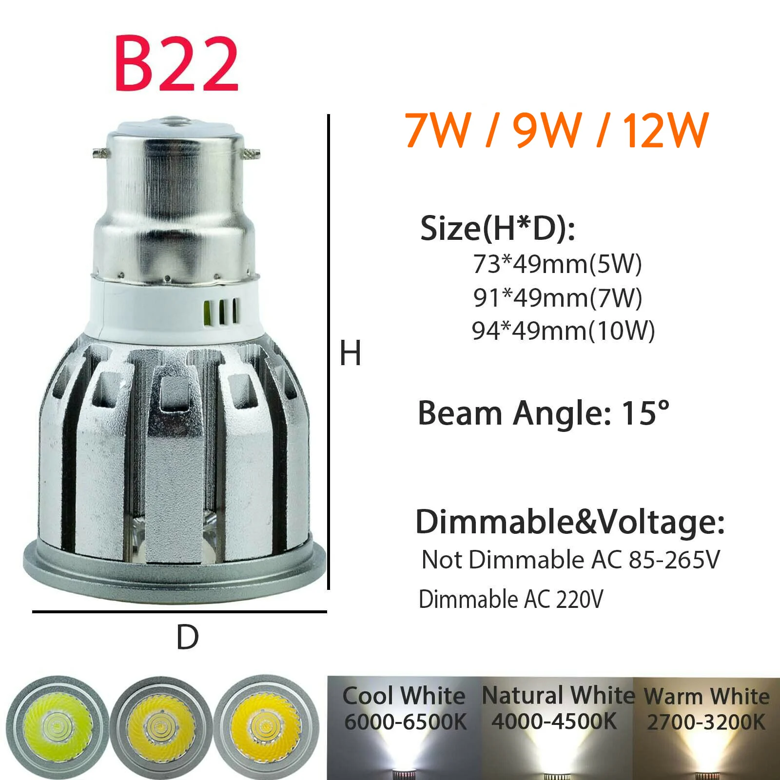 Тип цоколя: E27 / E12 / E14 / GU10 / GU5.3 / B22 / B15Мощность: 7 Вт/9 Вт/12 ВтМатериал: алюминийТип чипа: COBУгол луча: 15 °Срок службы: более 50 000 часовДиммируемый и напряжение: Диммируемый переменный ток 110 В/Диммируемый переменный ток 220 В/недиммируемый переменный ток 85-265 вСветильник Цвет: холодный белый 6000-6500K; Естественный белый 4000-4500K; Теплый белый 2700-3200KСертификация: CE & ROHSГарантия: 3 года