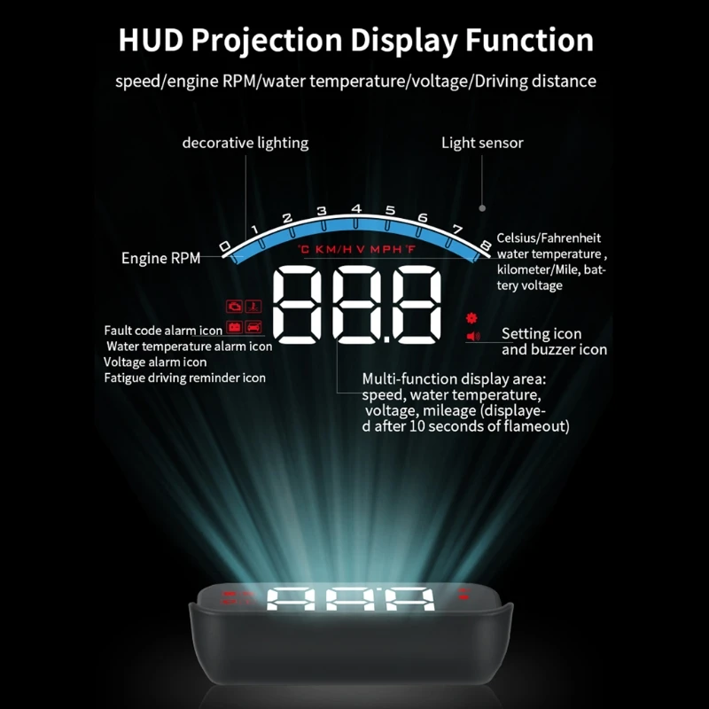 Особенности:100% новый и высокое качествоСкорость (км/ч или миль/ч), превышение скорости сигнализации,Об/мин, об/мин сигнализацияТемпература воды (°C или °F), высокая температура воды сигнализацияНапряжение дисплея, Сигнализация низкого напряженияСигнализация с кодом неисправности,Напоминание об усталости вождения,Пробег (отображается после 10s отключения питания автомобиля)Ручная или автоматическая регулировка яркости
