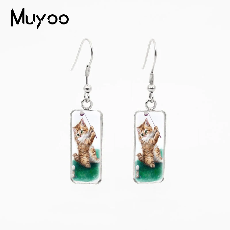 Новое поступление, прямоугольные серьги-подвески с изображением мультяшных забавных кошек, котят, играющих в гольф, С рыболовным крючком, ювелирные изделия