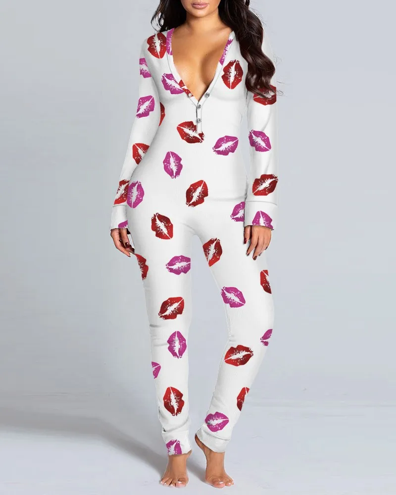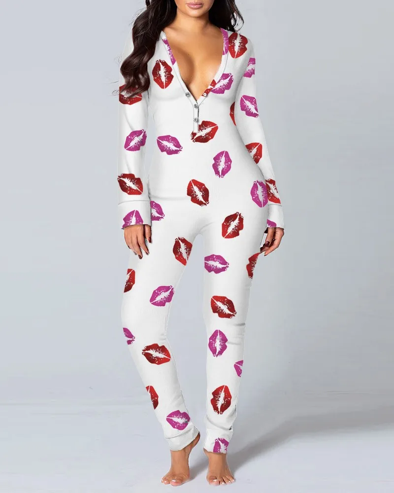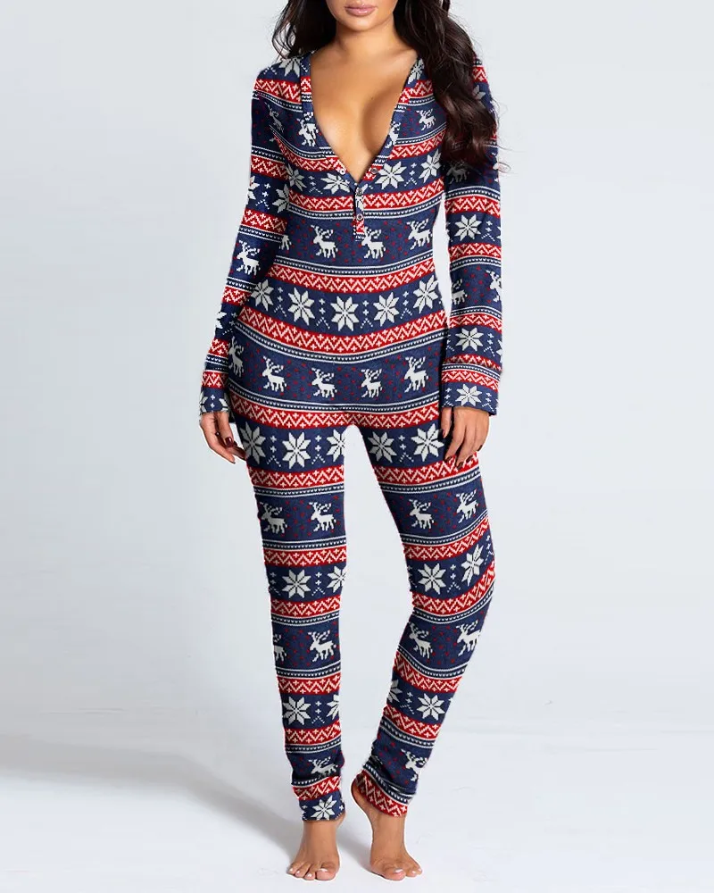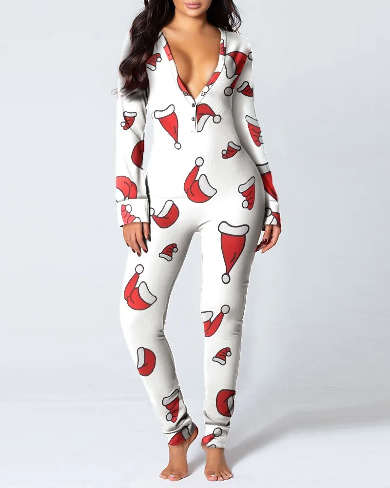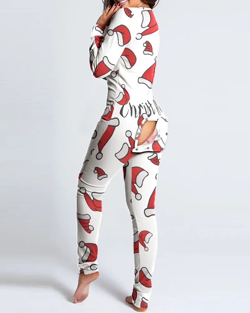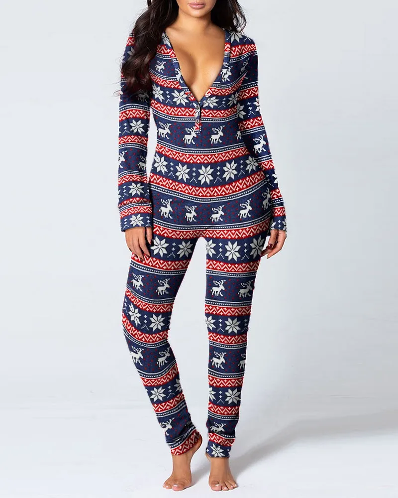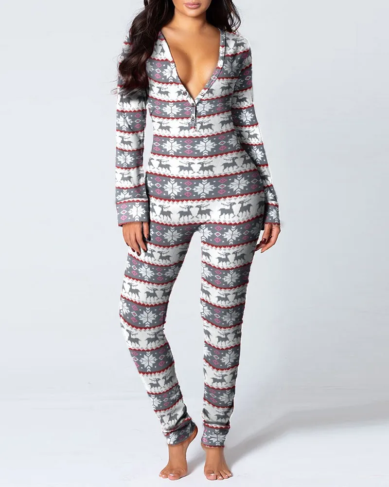 Сексуальная пижама, женский комбинезон на пуговицах, спереди, сзади, ягодицы, комбинезон с клапаном, домашняя одежда, Рождественский принт на пуговицах