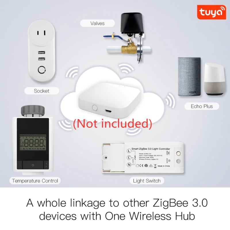 2. Беспроводной шлюз Tuya ZigBee должен работать с: беспроводной концентратор ZigBee-это обязательное соединение с клапаном, а также с различными интеллектуальными продуктами ZigBee, Который оказался центром управления мостами для умных домов, который играет незаменимую роль для всех продуктов ZigBee и реализует всю связь вашего дома, действительно хорошая замена нестабильной сети Wi-Fi.