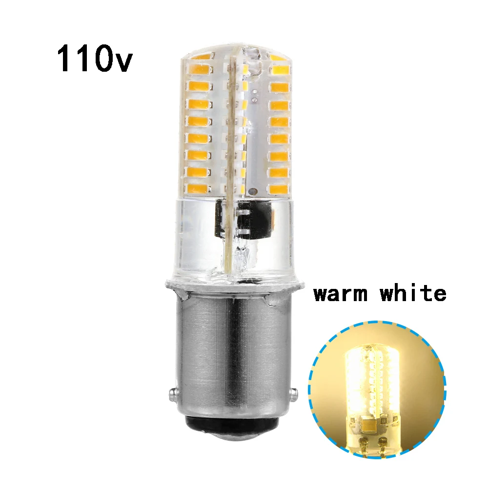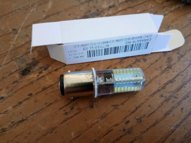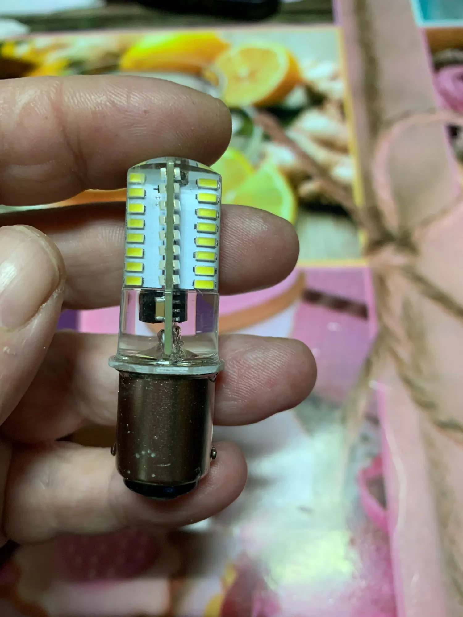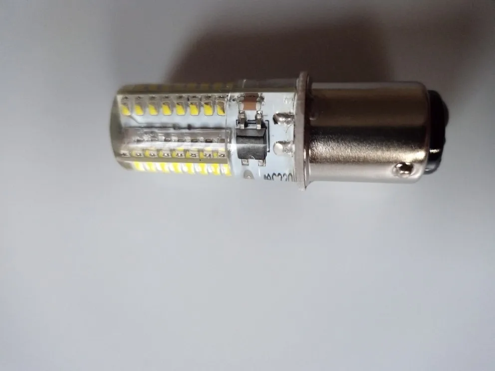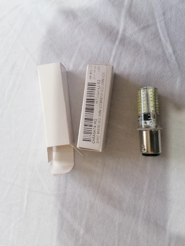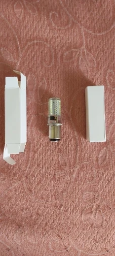 На мою машинку Pfaff hobby1122 подошла лампочка светит белым проходным светом как я и хотела (мощность родной лампы 240v15w с двумя точками внизу и двумя пупырками по бокам т е без резьбы на колбе ) надеюсь понятно описала на последнем фото родная лампа )