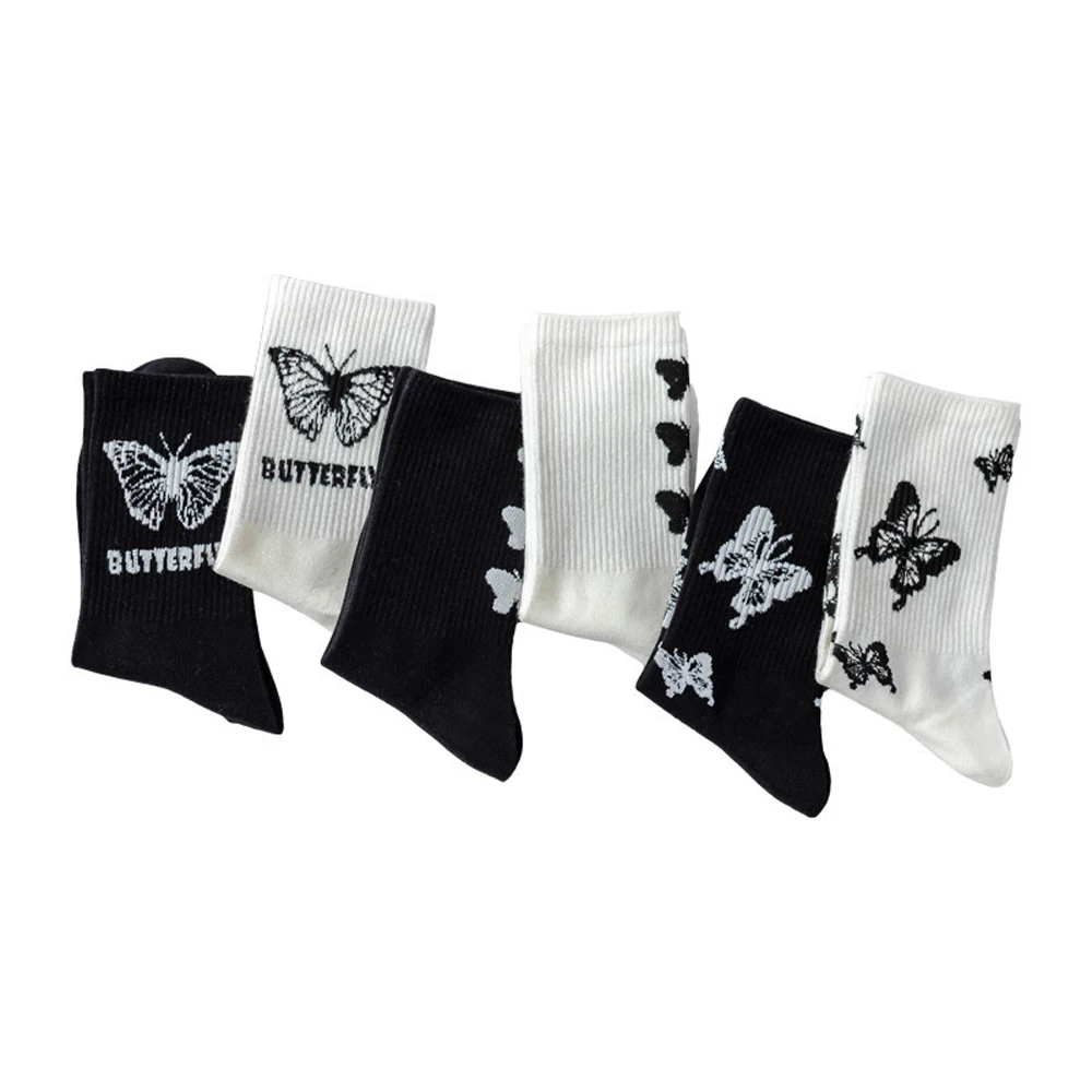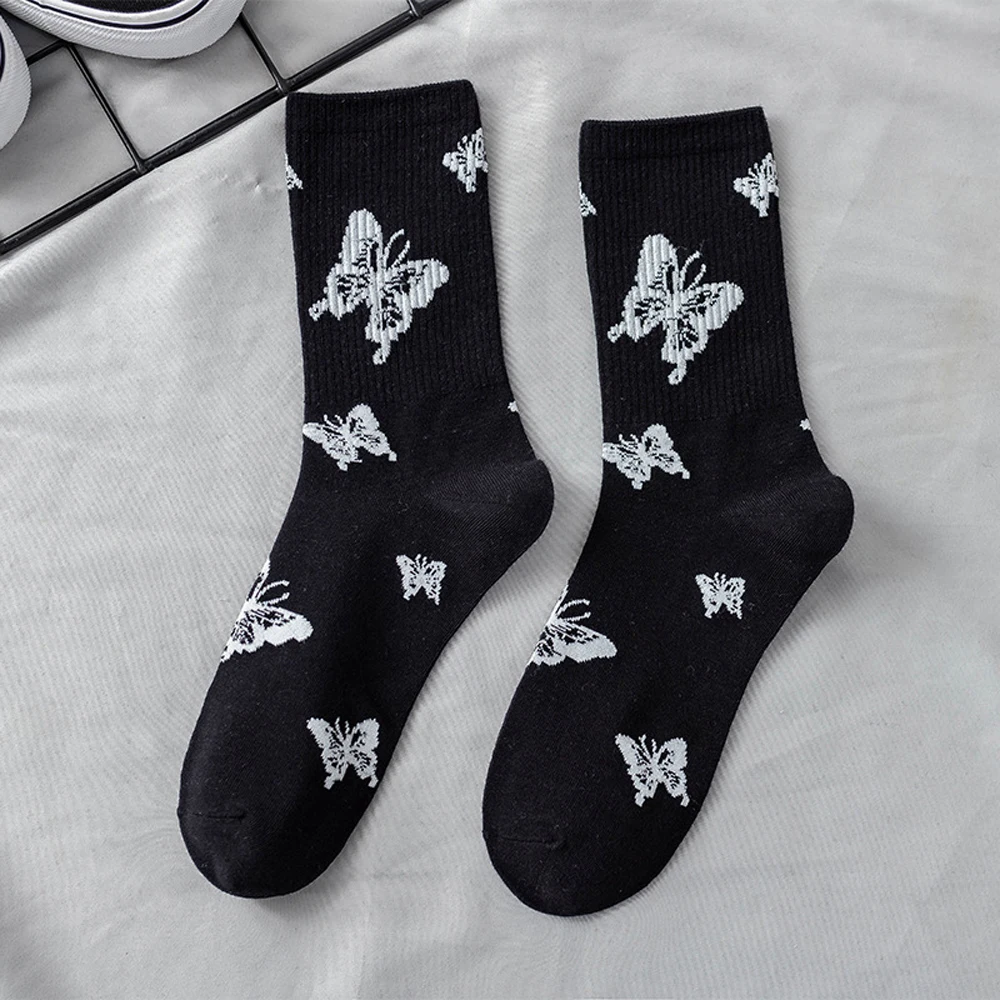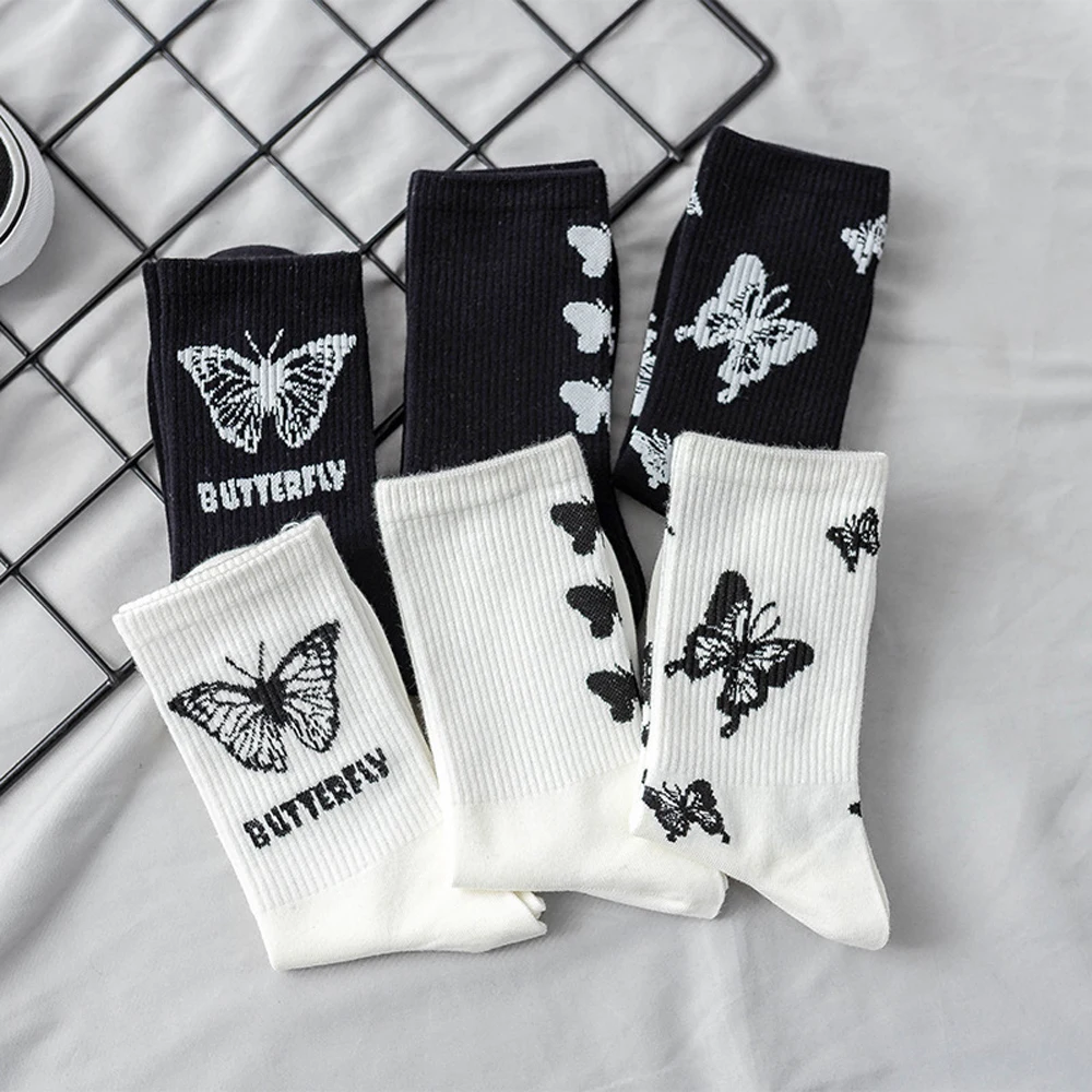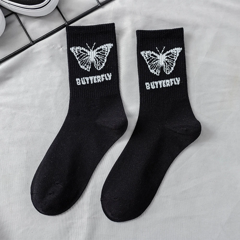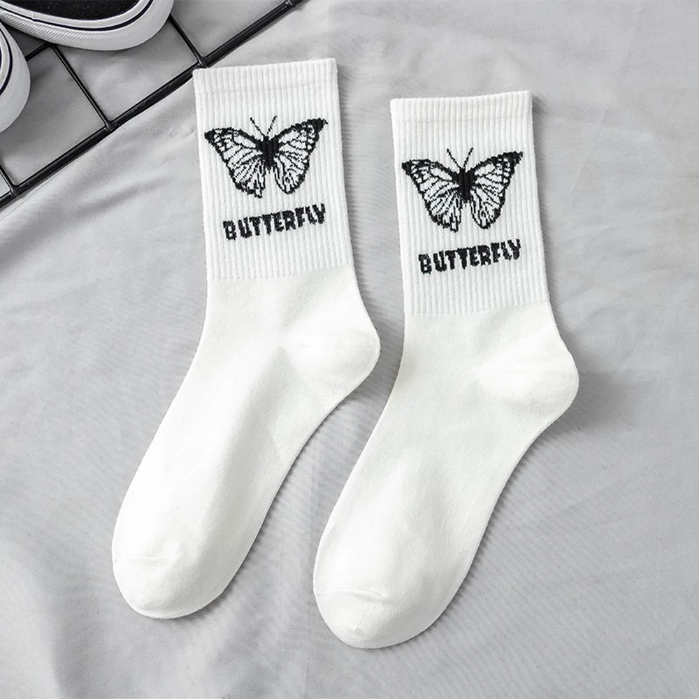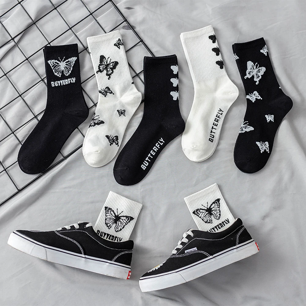 1 пара черный, Белый Цвет Бабочка, хлопковые носки для женщин и мужчин, модная одежда для девочек повседневная одежда в стиле хип-хоп Harajuru дышащие гольфы