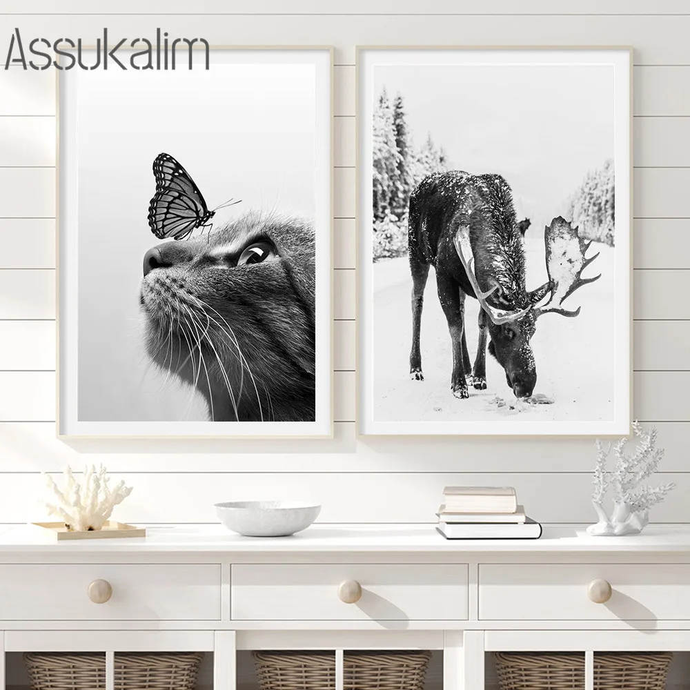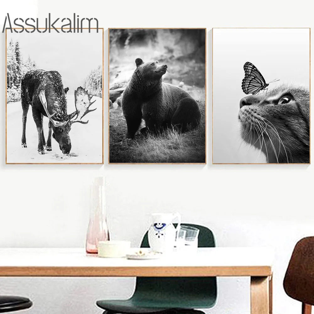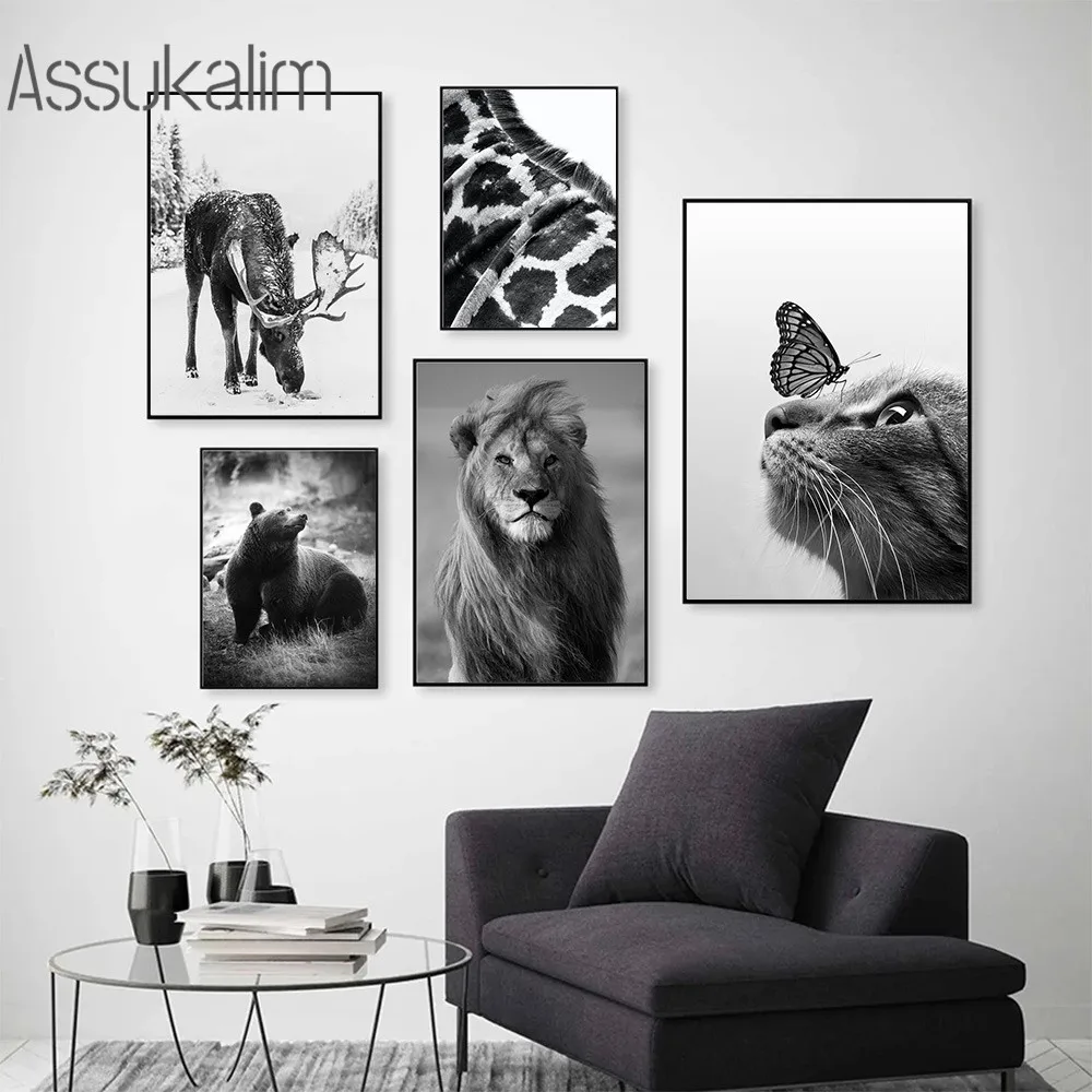 Плакат на стену с изображением черно-белых диких животных, принты оленей, Львов, кошек, скандинавские настенные картины, декор для гостиной