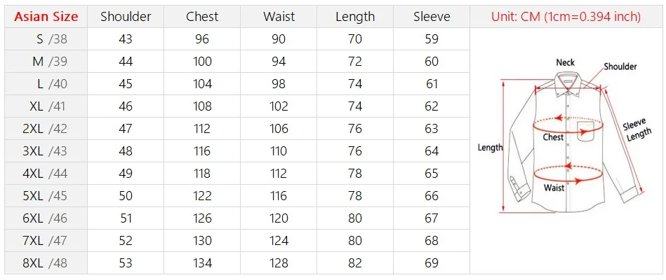 Таблица размеров-это размеры рубашки, а не тела. Обычно размер рубашки должен быть больше размера тела. Если обхват груди 100 см, лучше выбрать рубашку с ростом 104 см или 108 см. Единицы измерения: см, 1 дюйм = 2,54 см