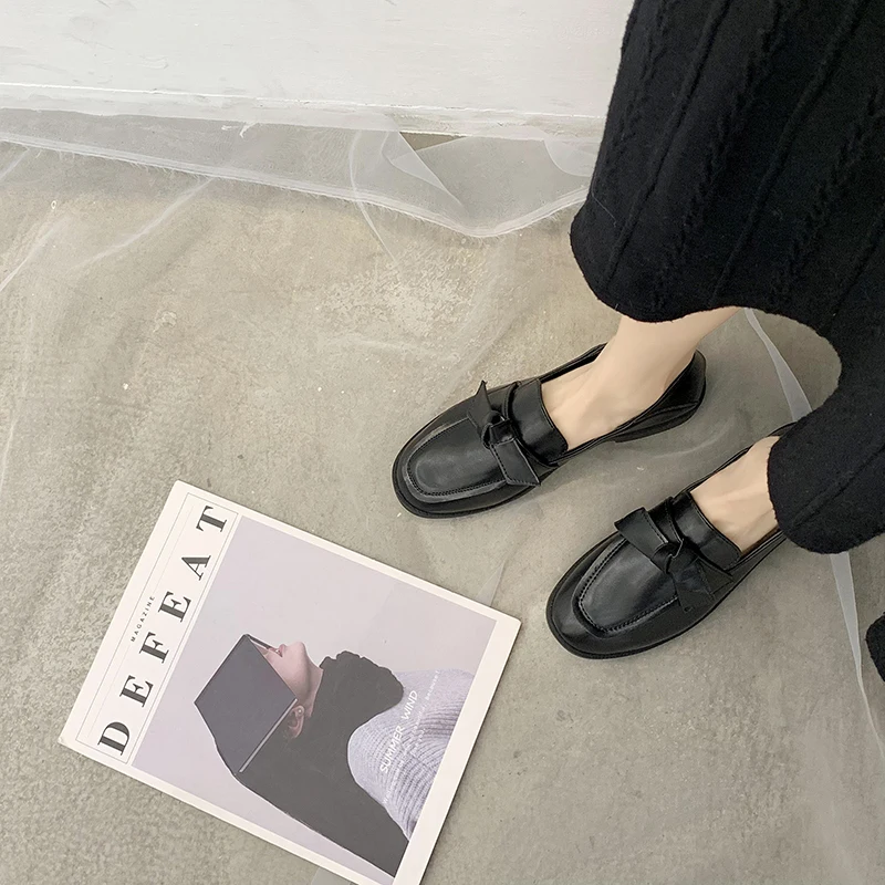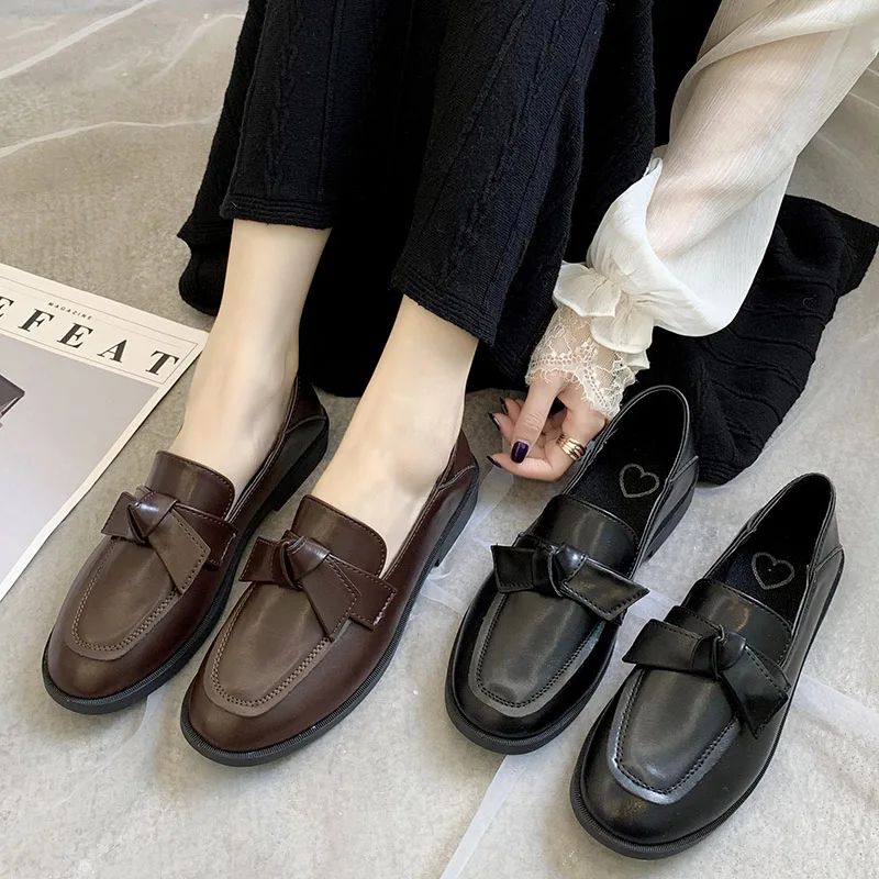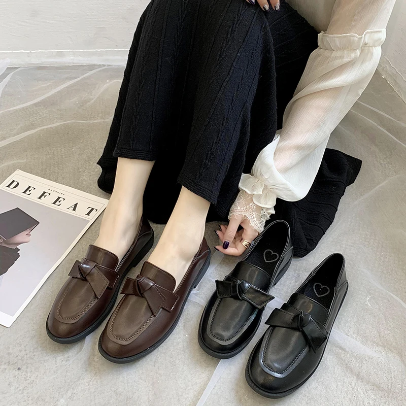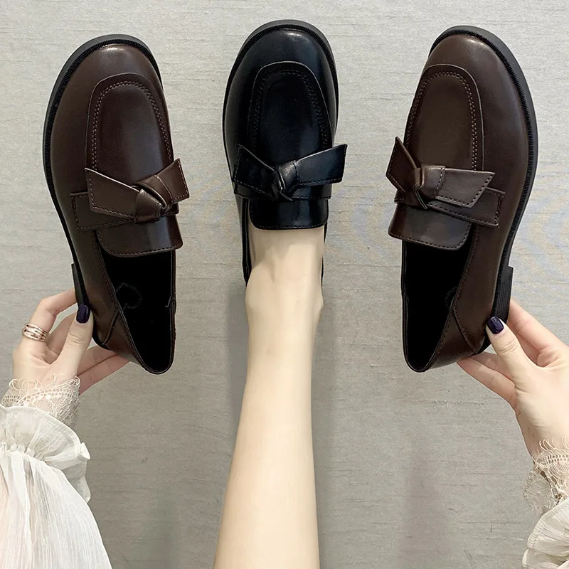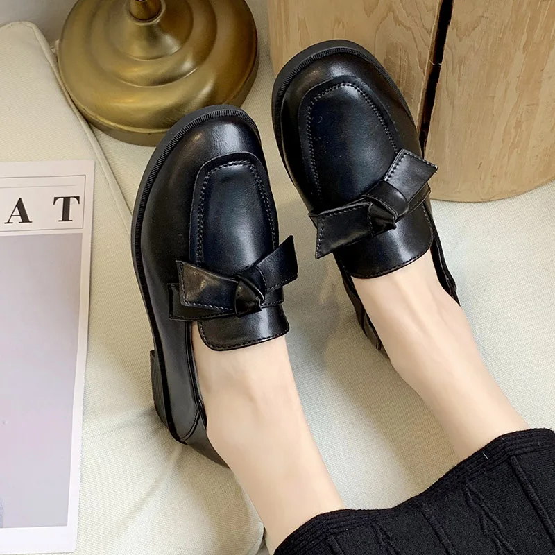 Женские лоферы на плоской подошве, демисезонные, с бантиком, кожаные, черные, плюшевые, теплые, 8897N