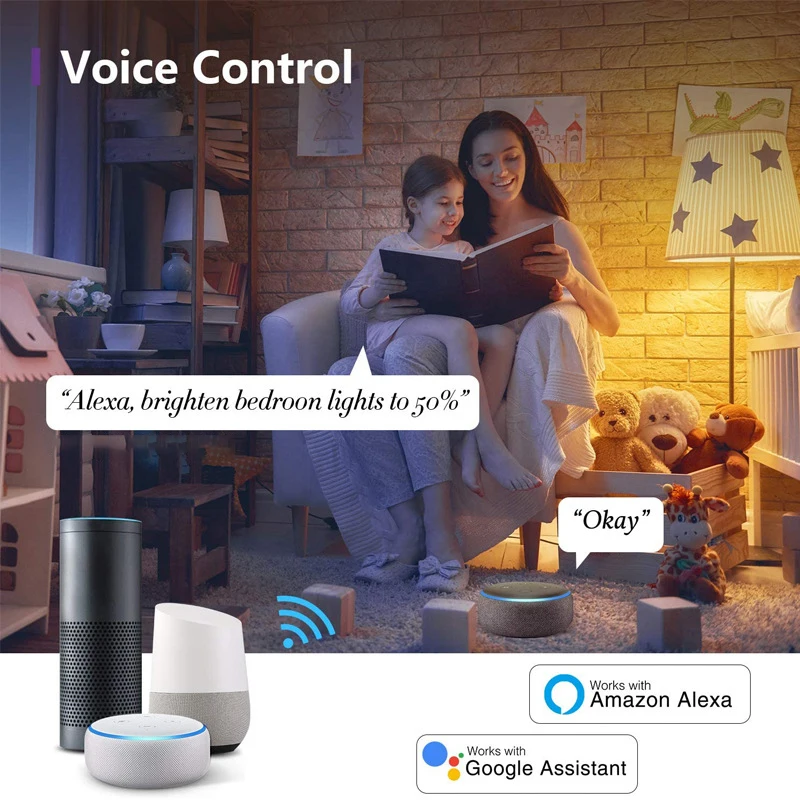 1. Голосовое управление: простое Голосовое управление всеми умными лампами с помощью интеграции с Amazon Alexa Echo или Google Home Assistant, это включает включение/выключение, яркость. Ex, вы можете сказать, "Alexa включит мой умный светильник с яркостью до 50 процентов". Не требуется ни ступицы, ни моста!