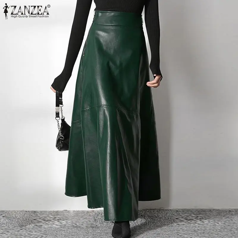Юбка ZANZEA Женская трапециевидная на молнии, модная офисная Повседневная Однотонная юбка-оверсайз из искусственной кожи, с завышенной талией, весна 2021