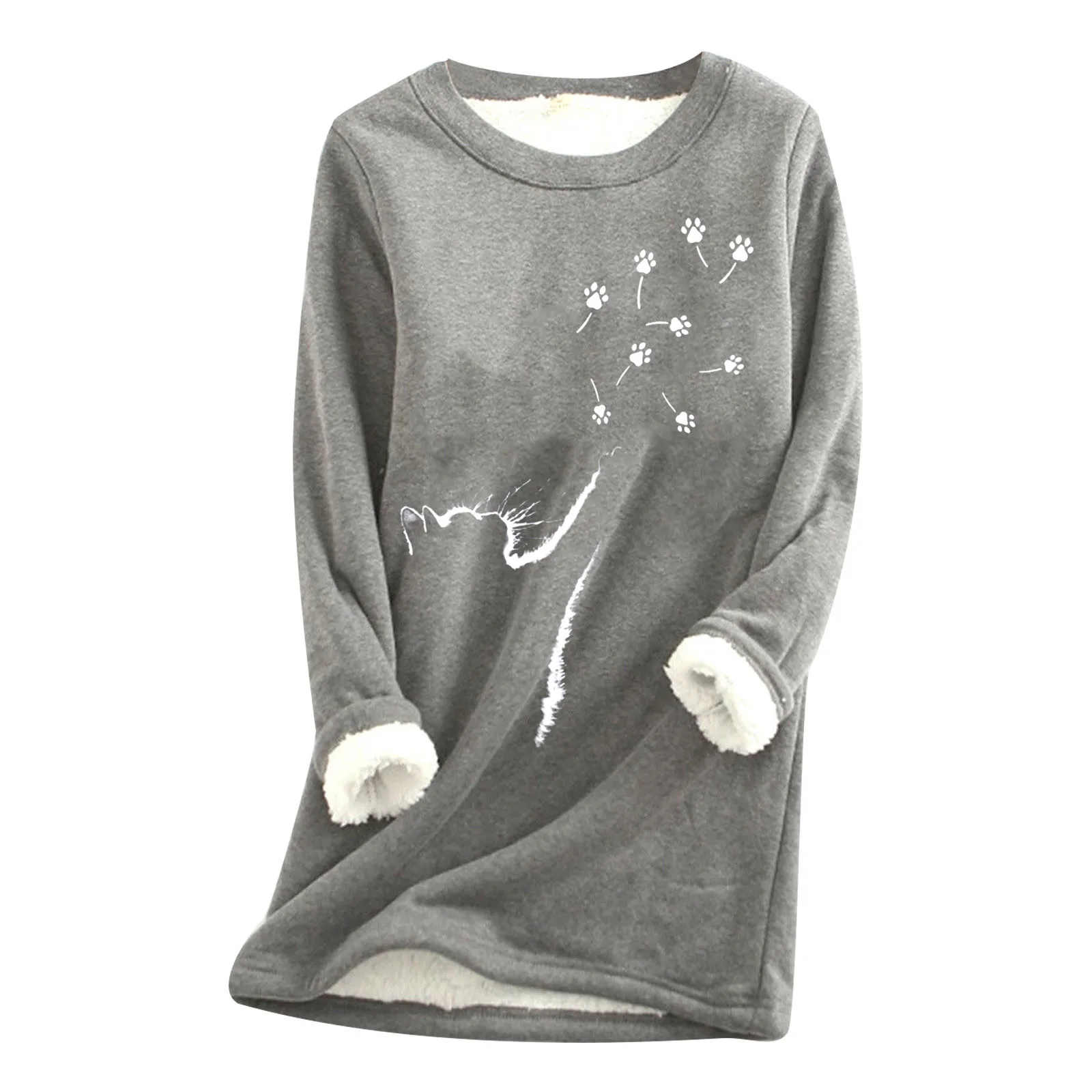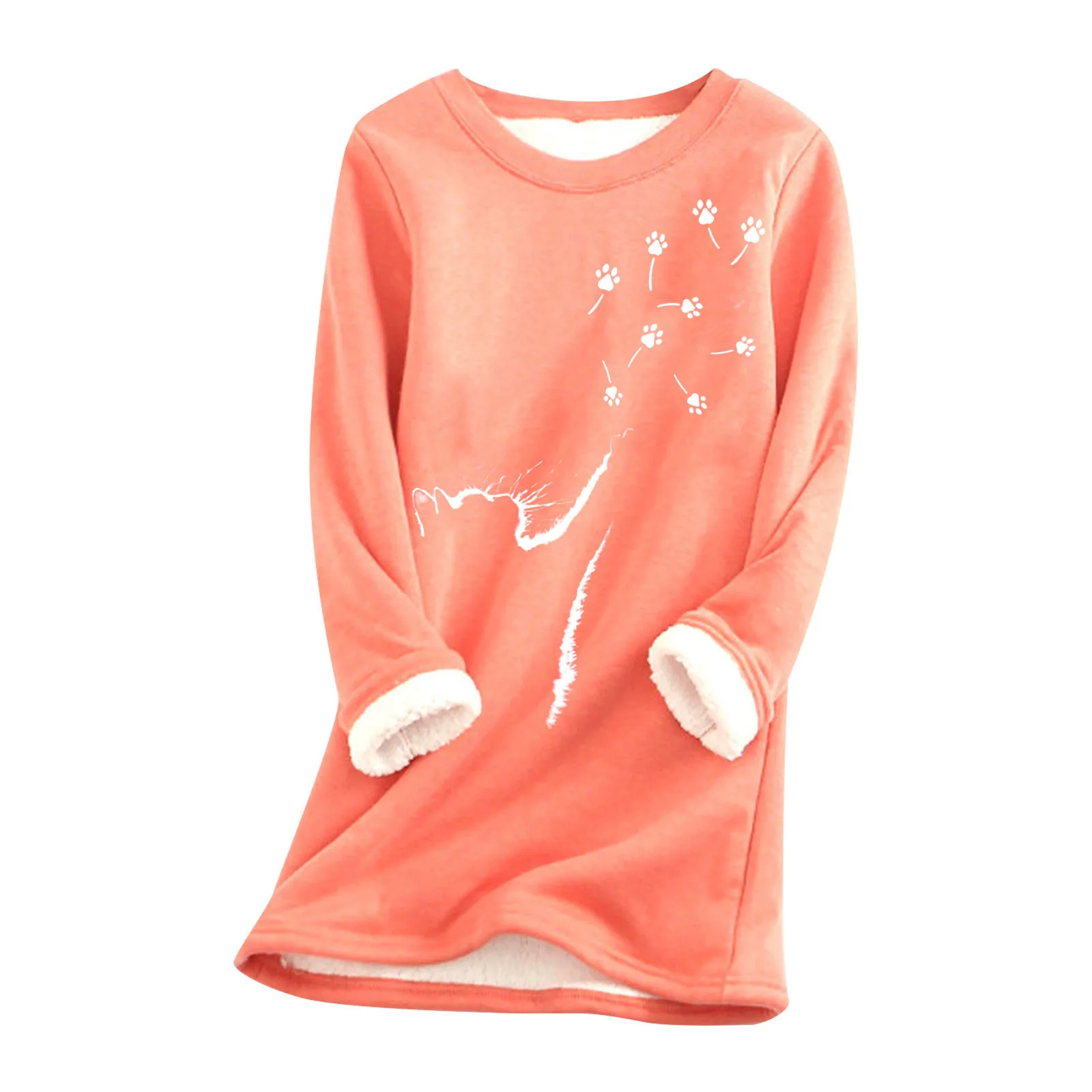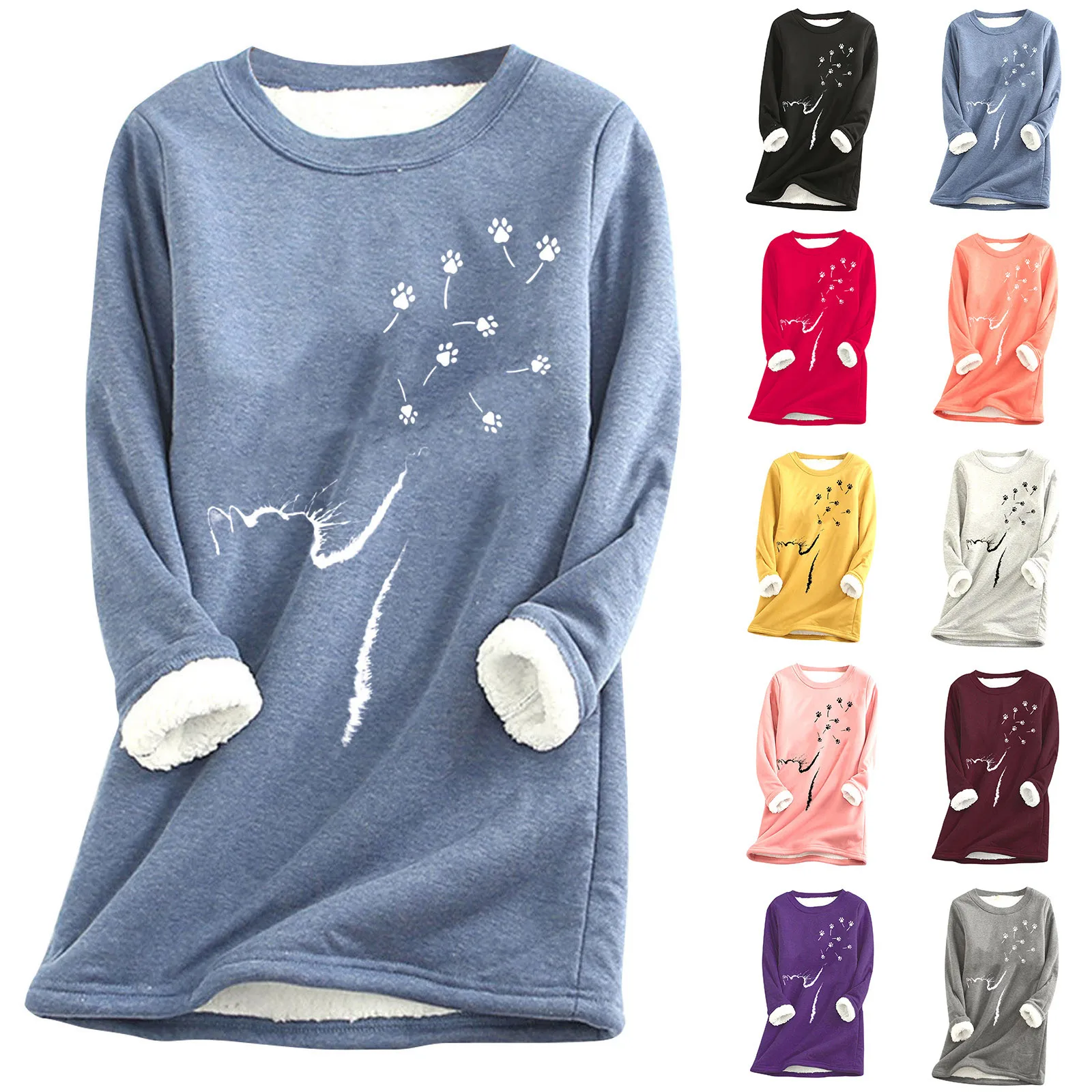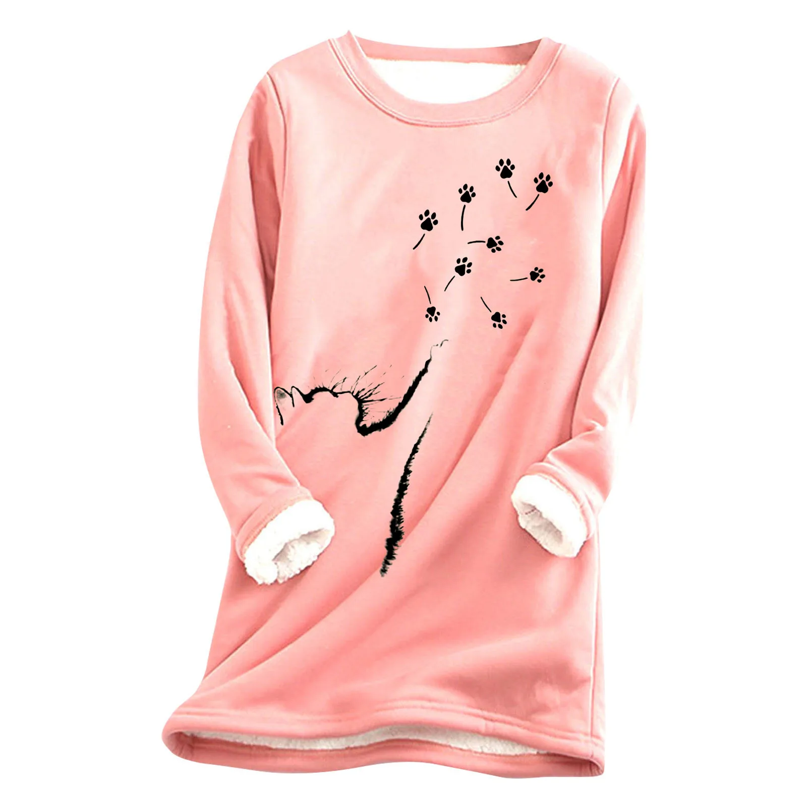 Женская зимняя толстовка с капюшоном, плотная флисовая толстовка, бархатная теплая утепленная одежда с круглым вырезом, худи с принтом кошки, Женская толстовка