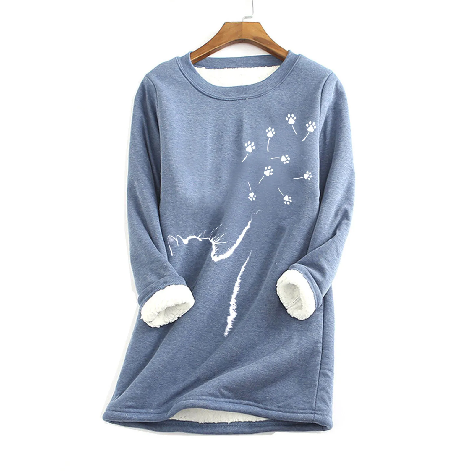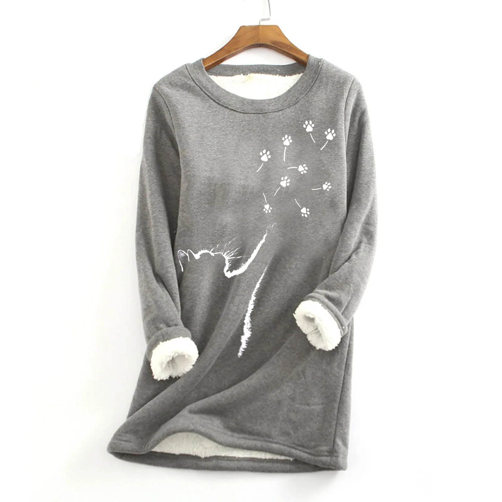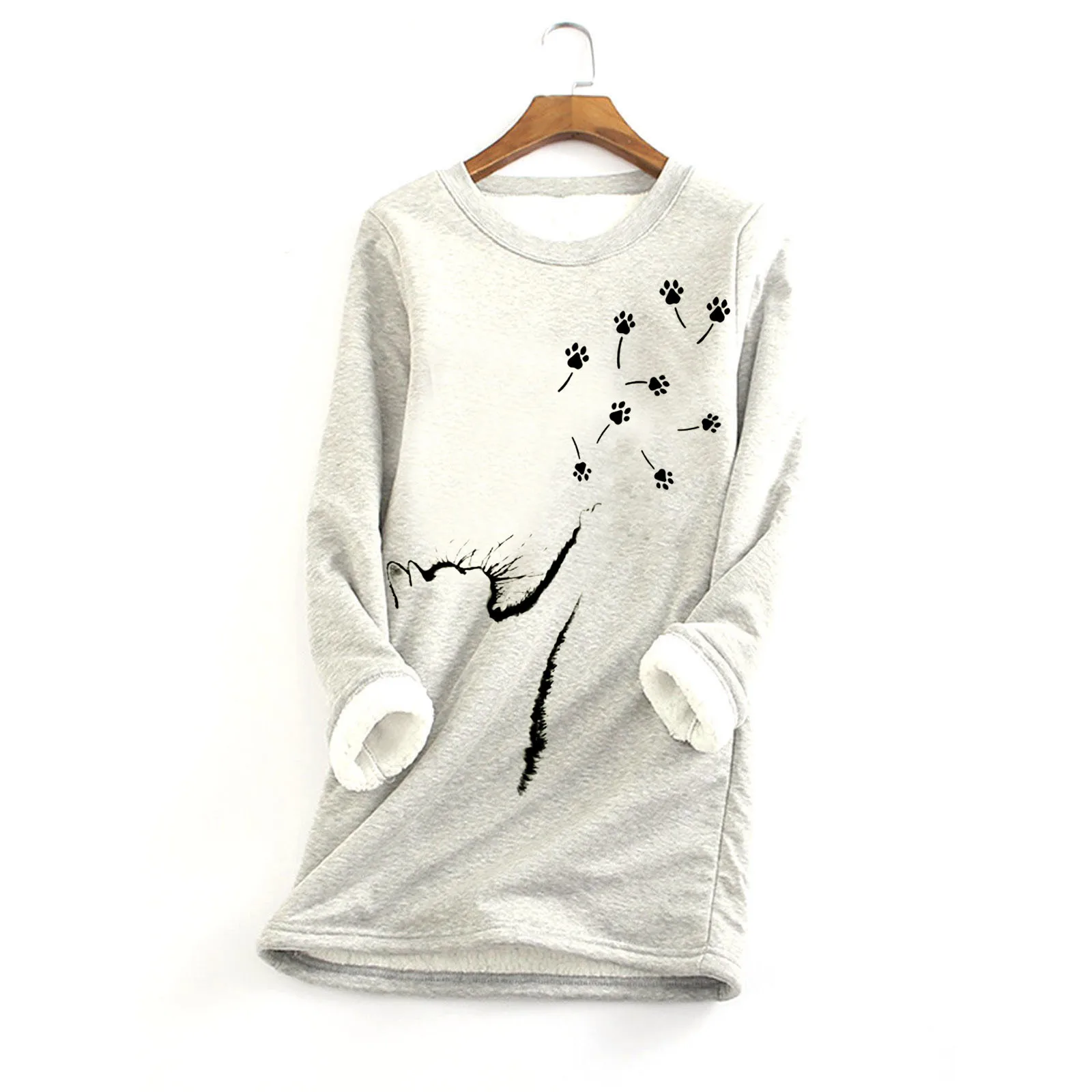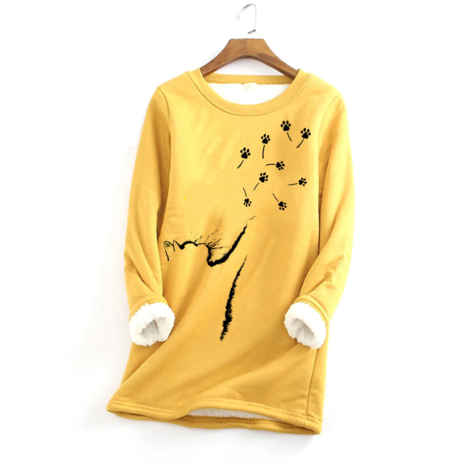 Женская зимняя толстовка с капюшоном, плотная флисовая толстовка, бархатная теплая утепленная одежда с круглым вырезом, худи с принтом кошки, Женская толстовка