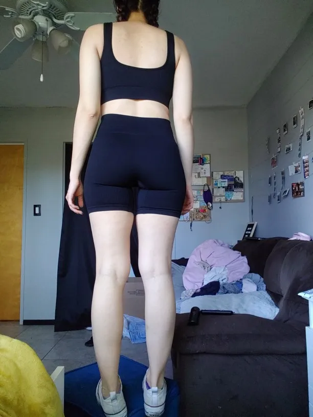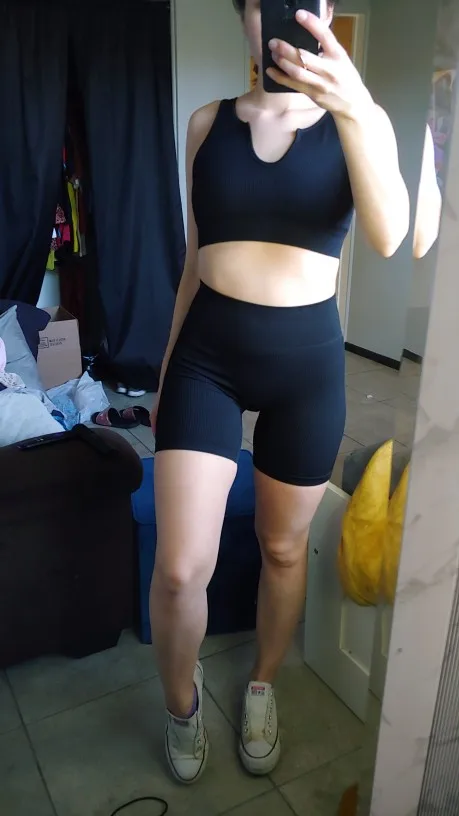 Я изменил черный размер с u-образным вырезом на M. Мой новый любимый комплект! Очень милое и удивительное качество, ткань плотная и эластичная. Шорты не сжимают нижнюю часть моей ноги, хотя они средние (я обычно размер до большого, но мне не нужно), и они Идеальная длина! Я 5'7 "(170 см), талия 75 см, бедра 102 см
